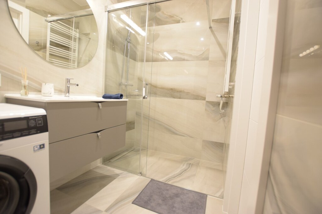 W łazience kabina prysznicowa z odpływem liniowym, wyposażona w pralkę i dużą ilość miejsc do przechowywania.