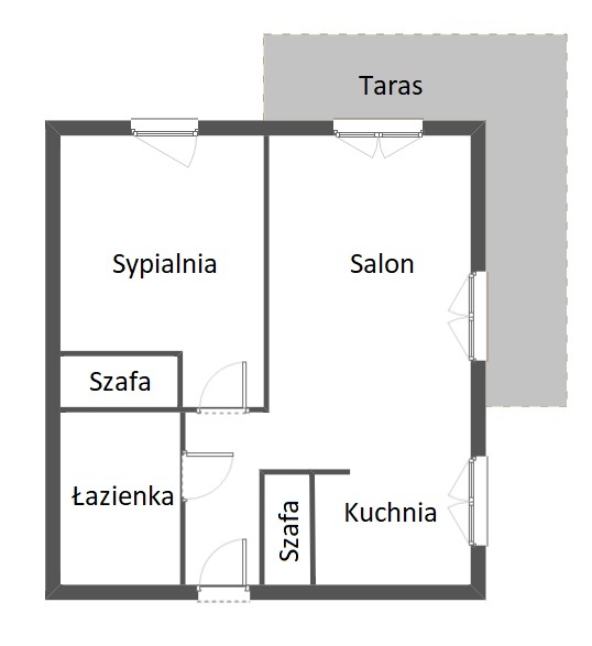 Mieszkanie składa się z przedpokoju. Łazienki z WC z kabiną prysznicową. Salonu z aneksem kuchennym z wyjściem na taras oraz sypialni.