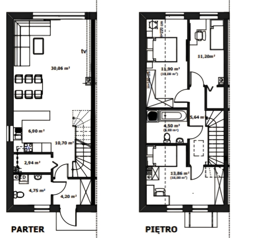 Parter: Otwarta strefa dzienna – salon z jadalnią (30,06m2) i kuchnią (6,90m2), wc (4,75m2), pom. gospodarcze (2,94m2).