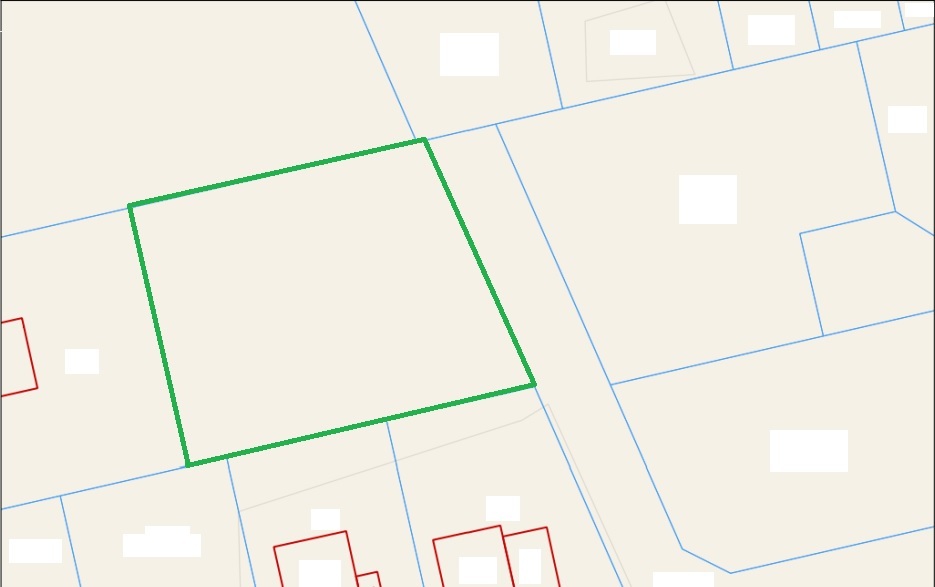 Działka o powierzchni 1763 m2, w kształcie zbliżonym do prostokąta o wymiarach 38x45 m.