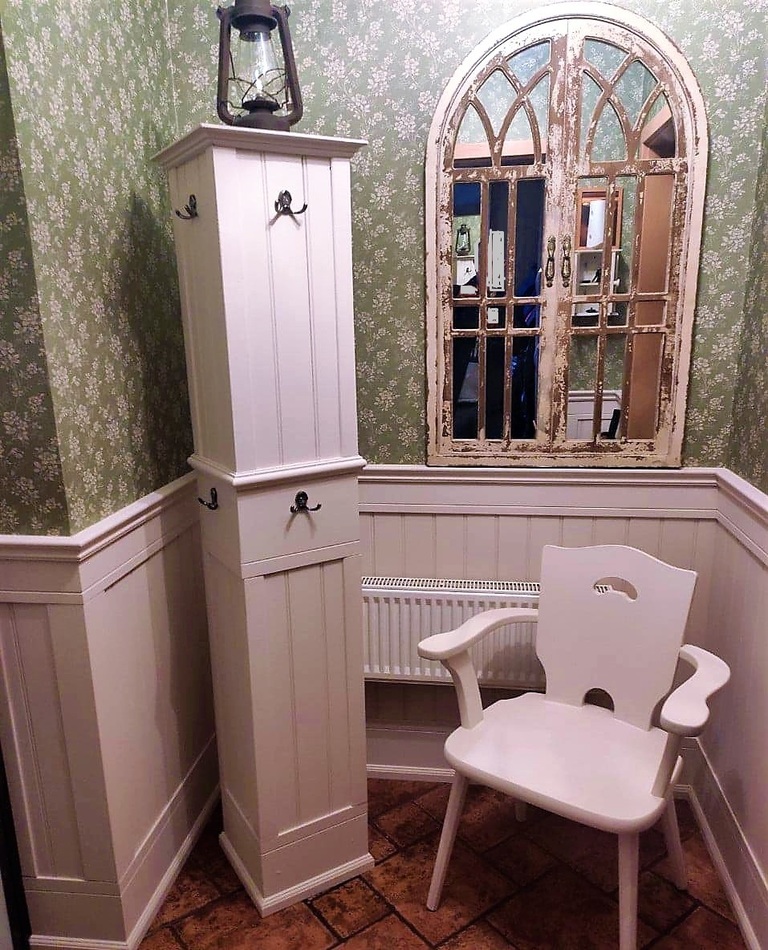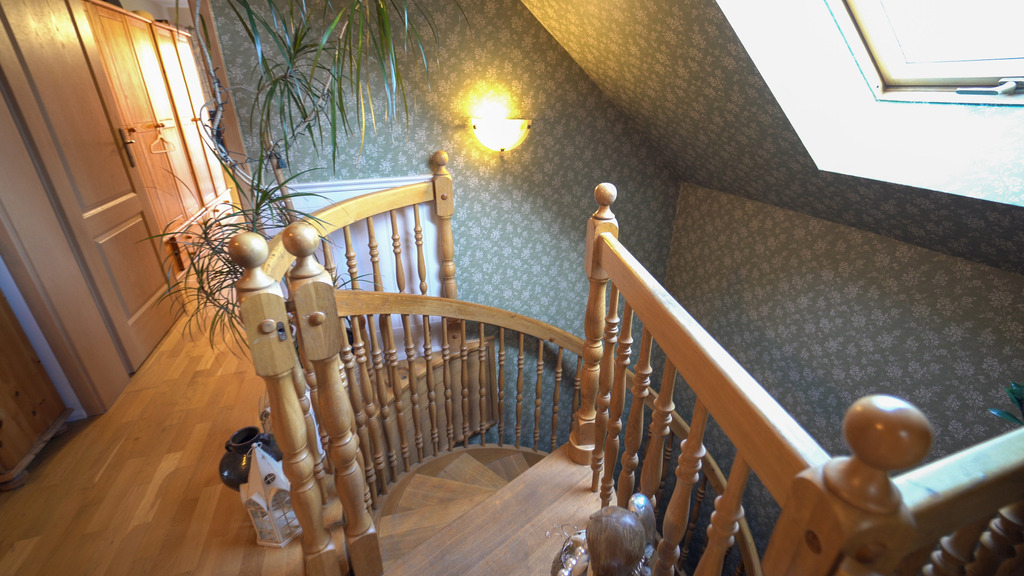 - na piętro prowadzą dębowe, kręcone schody, a tam :