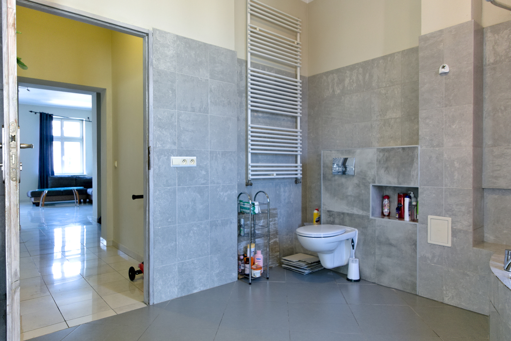 - klimatyczna łazienka z wygodną wanną i wysokim grzejnikiem drabinkowym