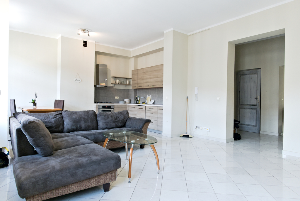 przejściowa łazienka, kuchnia otwarta na salon, zabytkowy, ale odrestaurowany budynek