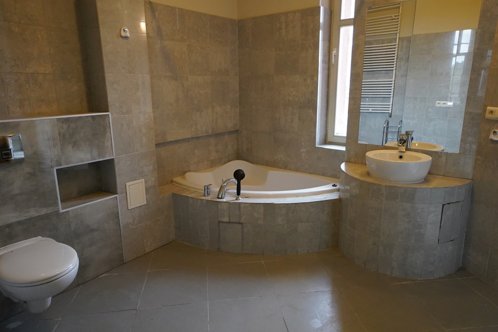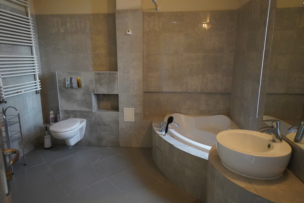 -przeszklona łazienka z wanną plus osobna toaleta z umywalką.