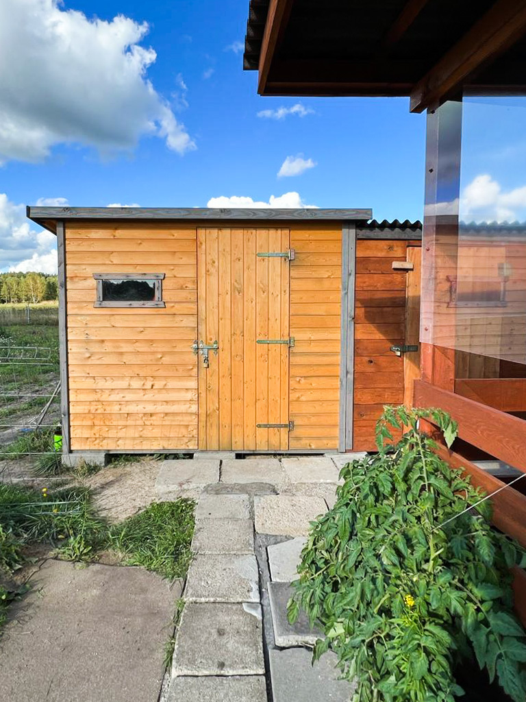 Zagospodarowany ogródek, nasadzenia (drzewka owocowe), wędzarnia oraz dwa drewniane budynki gospodarcze.