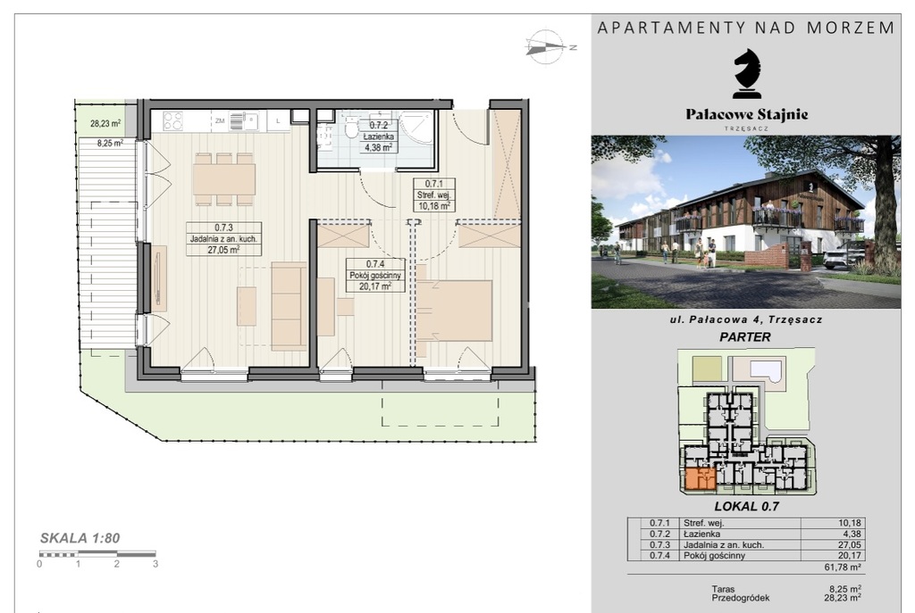 Pałacowe Stajnie to bazująca na historycznym obiekcie przypałacowym, inwestycja obejmująca 24 apartamenty o powierzchni od 29 m2 do 66,5 m2, w Trzęsaczu, w bliskiej odległości od pięknej plaży (około 500 metrów).