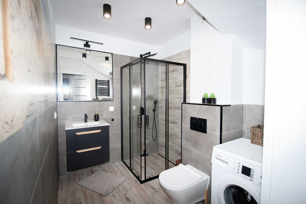 - Łazienka z WC , glazura i terakota, pralka, kabina prysznicowa, umywalka.