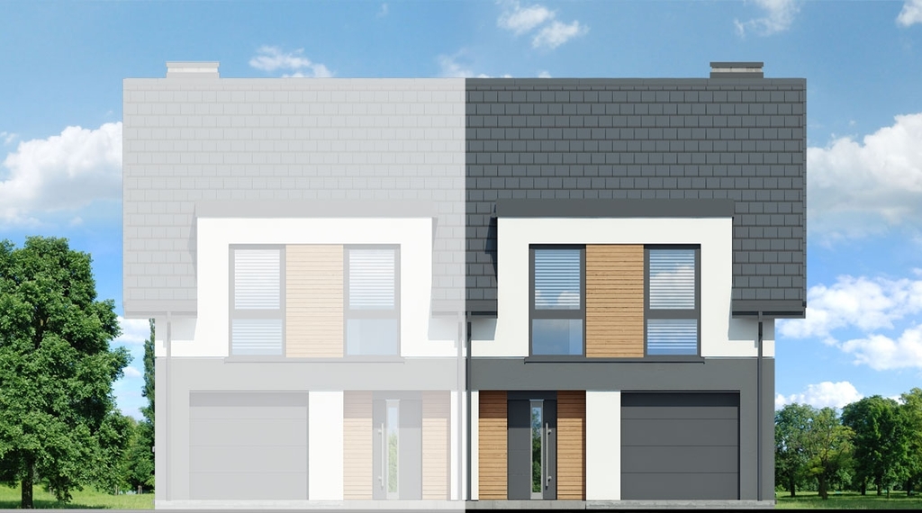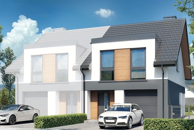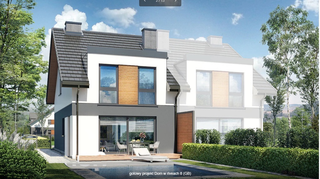 Poszczególne połówki postawione są na działkach o powierzchni 356 oraz 318 m2. Dom wybudowany według projektu Archeon "Dom w riveach 8 (GB)".