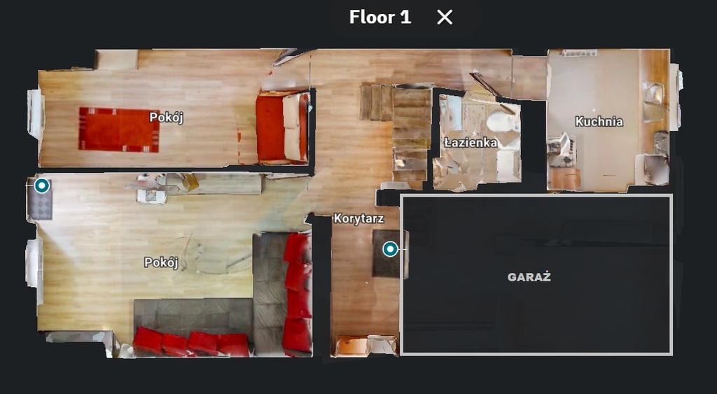 I kondygnacja: 2 pokoje, łazienka, kuchnia.
