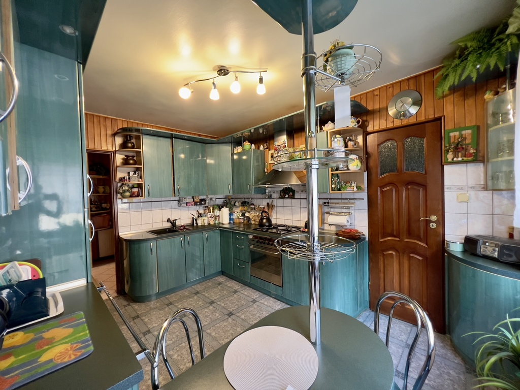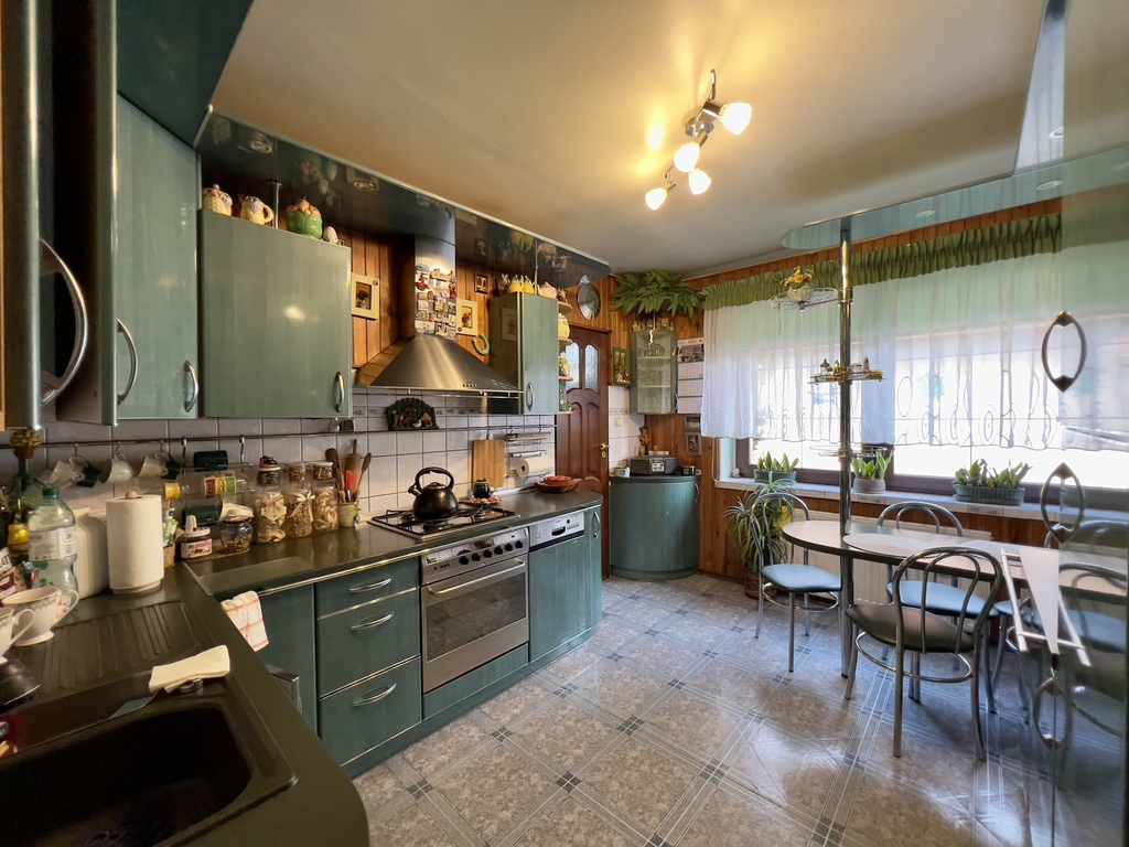 W kuchni są meble w zabudowie oraz wejście do spiżarni z oknem.