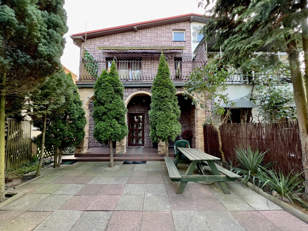 Przed domem podwórko z licznymi nasadzeniami oraz garażem blaszanym, który stanowi zakup obligatoryjny w wysokości 5000 zł.