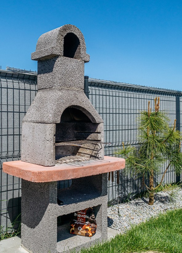 Zadbana trawa z rolki, liczne nasadzenia, plac zabaw z piaskownicą, miejsce do grillowania z grillem betonowym i ławą biesiadną.