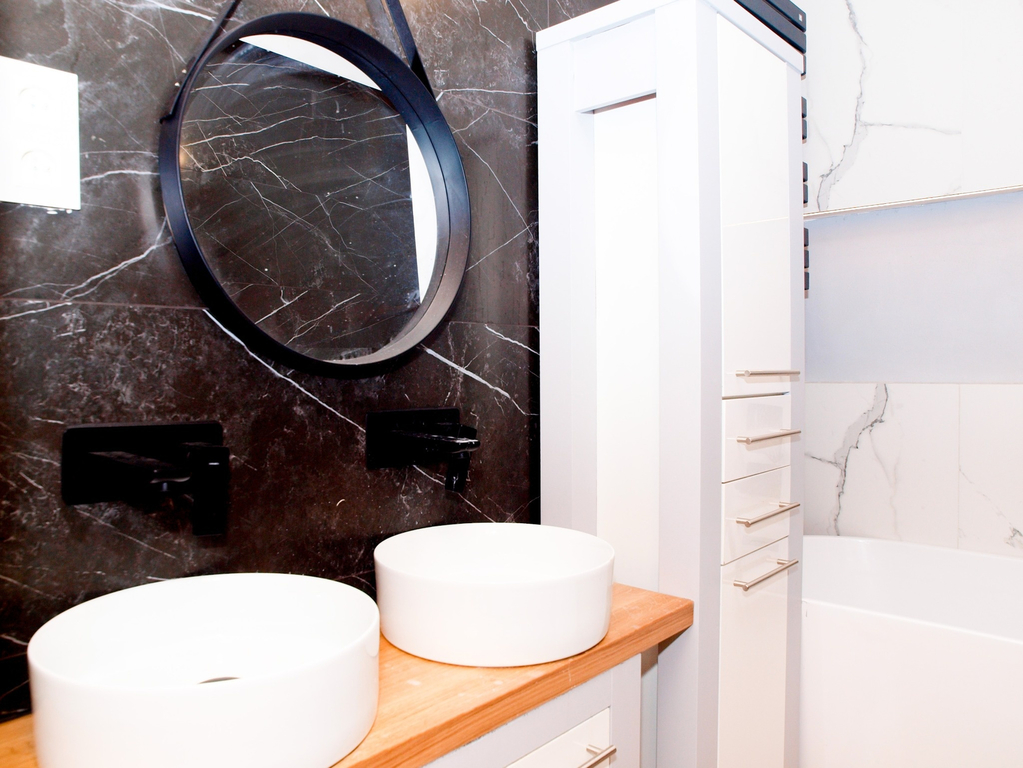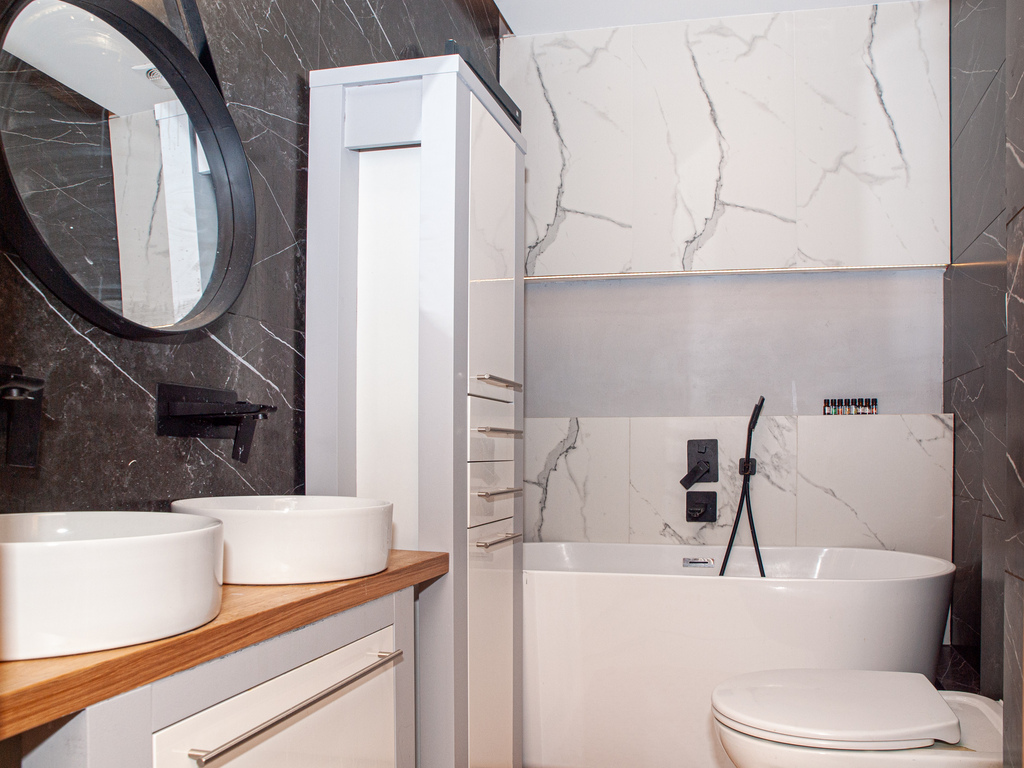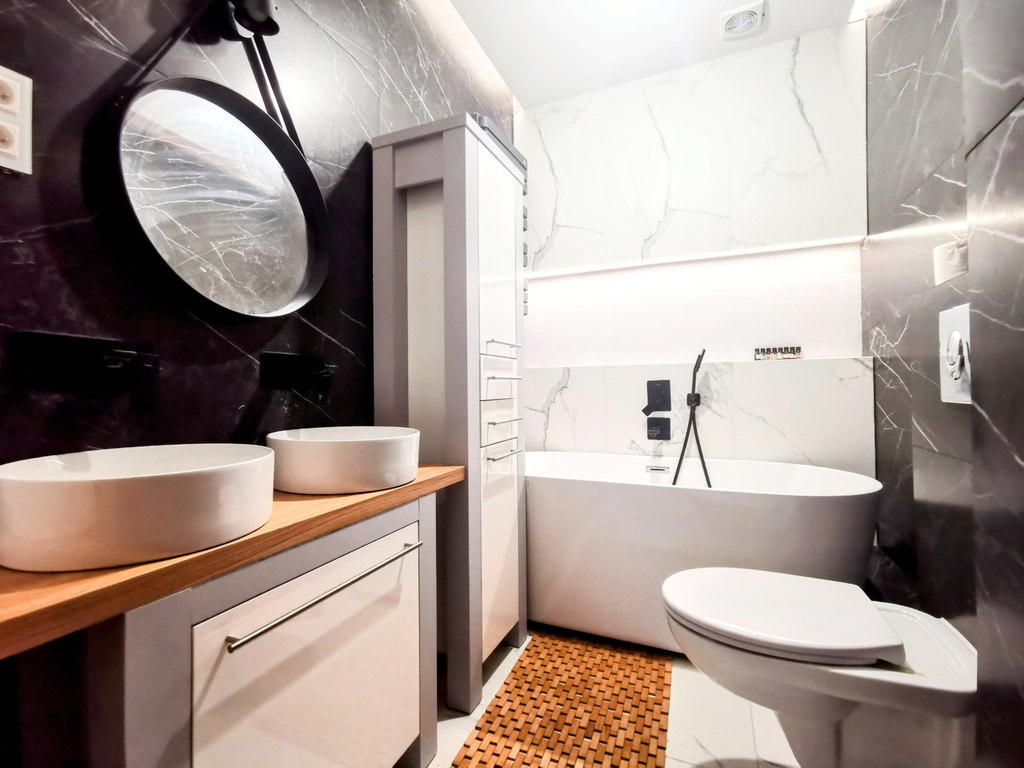 Nowoczesna kuchnia o powierzchni 8 m2 została wyposażona w sprzęt wysokiej jakości. Znajdziemy tu piekarnik z funkcją kuchenki mikrofalowej, płytę indukcyjną, zmywarkę, lodówkę z dozownikiem wody i kostkarką oraz dużą zamrażarkę. To idealne miejsce dla miłośników gotowania.
