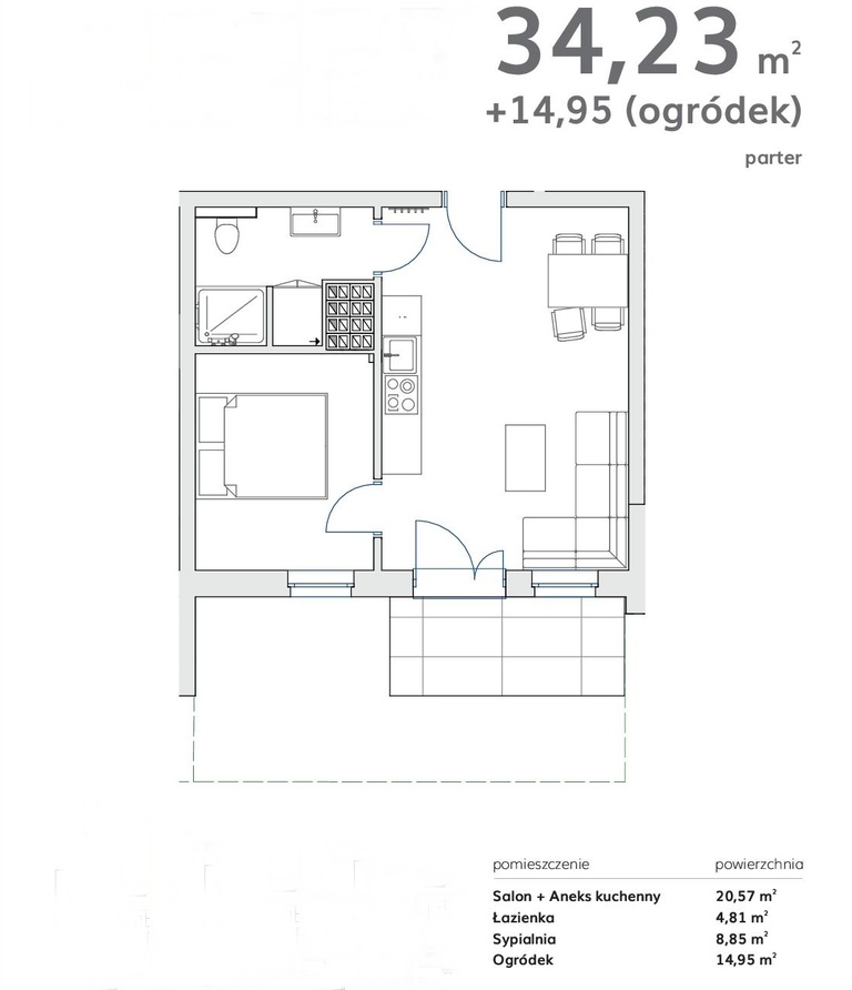 Apartament posiada swoje niezależne miejsce parkingowe na parkingu przed budynkiem. Do apartamentu przynależy taras powierzchni 14,95m2.