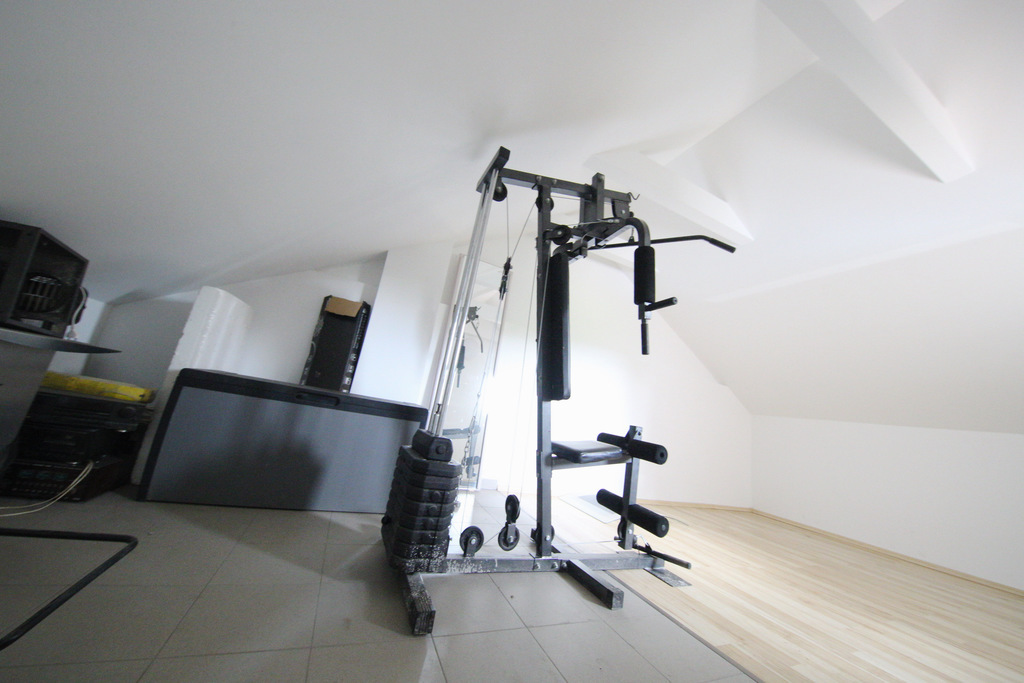 Przy budynku znajduje się garaż 2 stanowiskowy (wysoki) z pomieszczeniem gospodarczym nad dnim. W chwili obecnej jest zrobiona tam siłownia. Za garażem jest kolejne pomieszczenie gospodarcze typu rowerownia/wózkownia z wejściem na ogród.