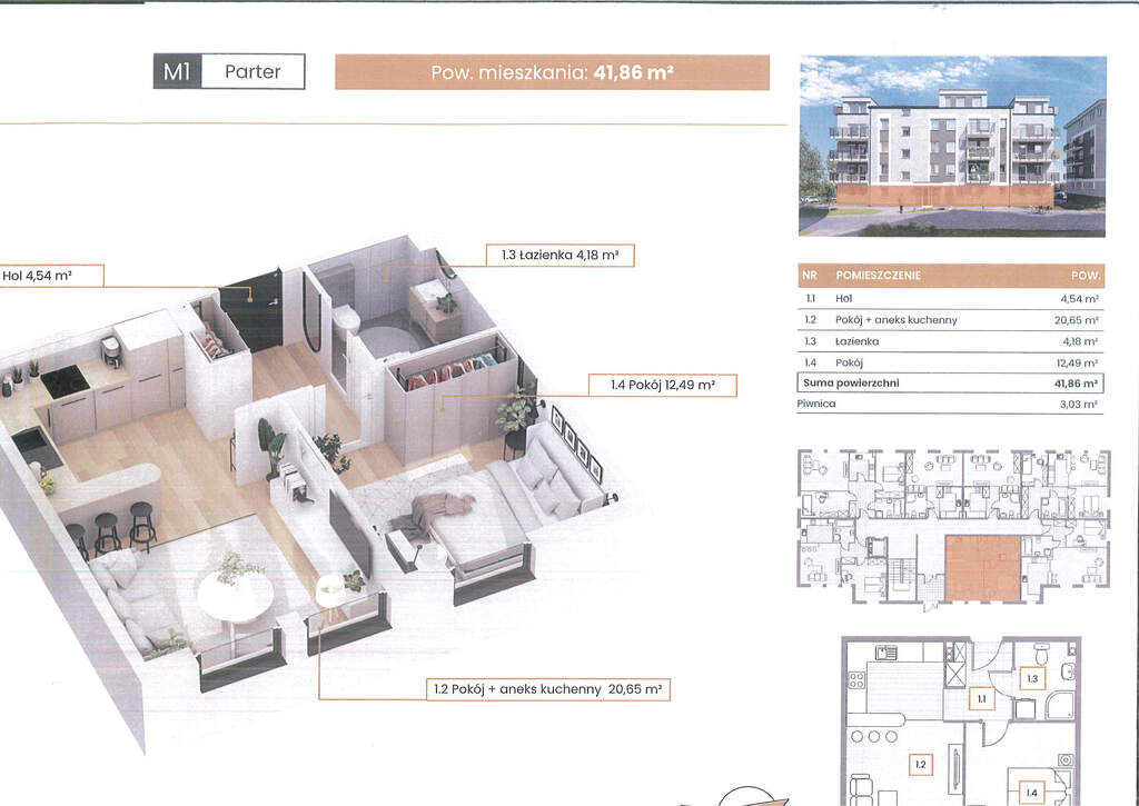Przedmiotowe mieszkanie znajduje się na parterze. Składa się z pokoju z aneksem kuchennym o powierzchni łącznej 20,65mkw, pokoju 12,49mkw, łazienki 4,18mkw, hallu 4,54mkw. Do mieszkania przynależy piwnica o powierzchni 3,03mkw.