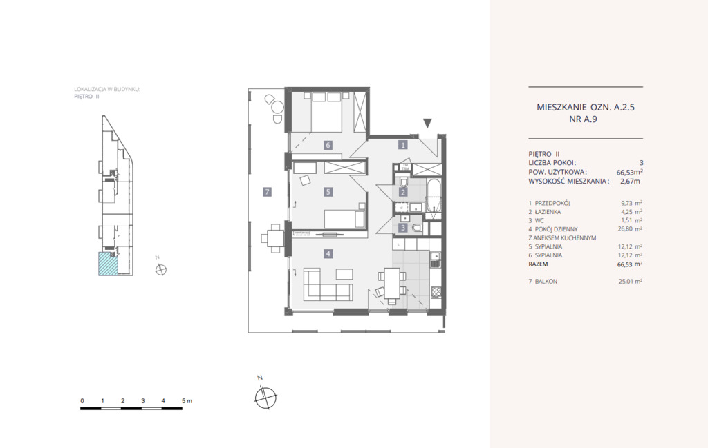 Przedstawiony apartament o powierzchni 66,53 m2 znajduje się na pierwszym piętrze budynku i posiada taras o powierzchni 25.01 m2 wychodzący na północny-zachód.