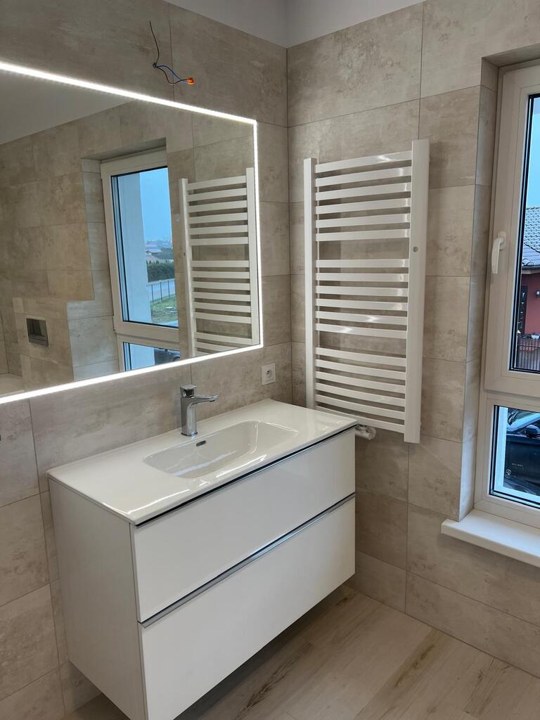 Na dole znajduje się kuchnia z meblami i sprzętem AGD (zmywarka lodówka płyta indukcyjna oraz piekarnik) salon z jadalnią, garaż, kotłownia, WC.