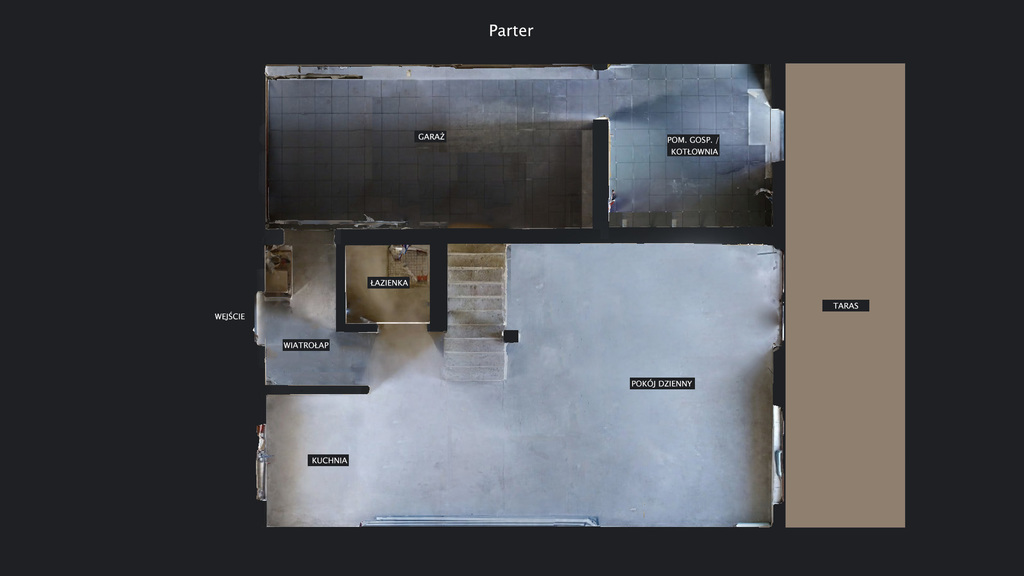Parter: wiatrołap 4,69m2, otwarta kuchnia 7,74m2, salon z jadalnią 28,07m2, korytarz, toaleta, kotłownia 8,35m2, garaż 17,58m2.