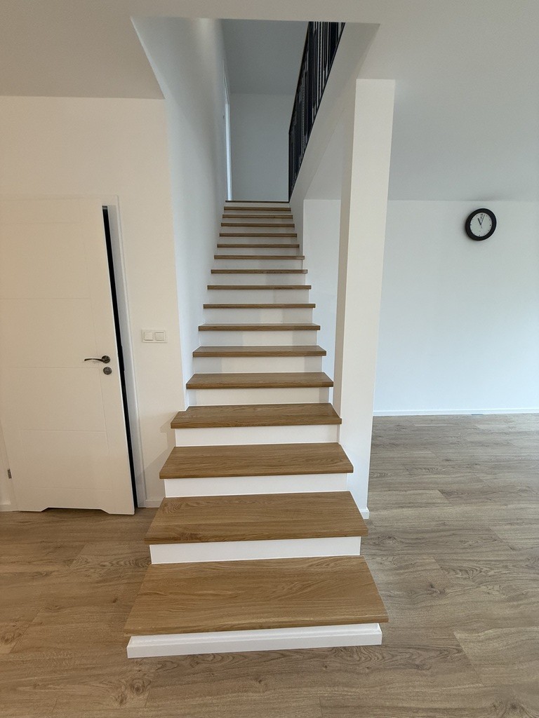 Ściany wygładzone i pomalowane, schody dębowe, balustrady stalowe.
