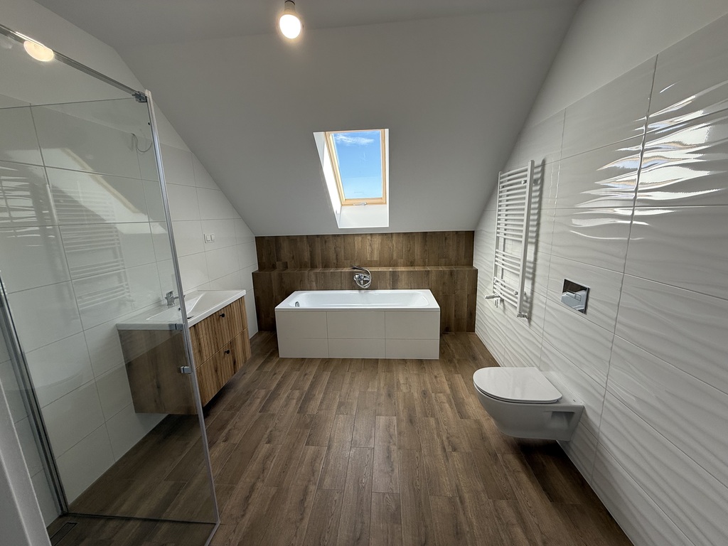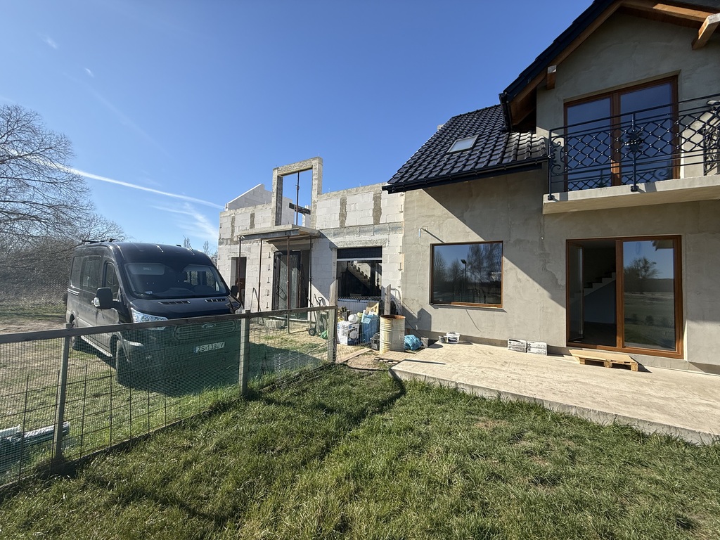 Dom wykończony z dobrej jakości materiałów. Ściany zostaną wygładzone i pomalowane. Dach pokryty dachówką ceramiczną, ocieplony wełną mineralną. Ogrzewanie podłogowe, piec gazowy 2 obiegowy z zasobnikiem wody, miejsce na kominek.