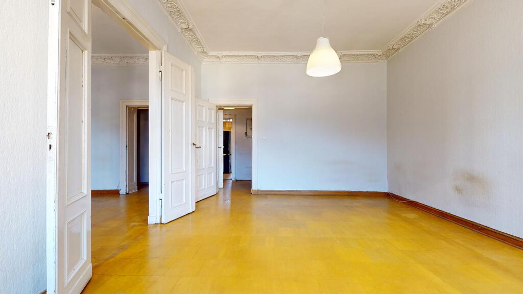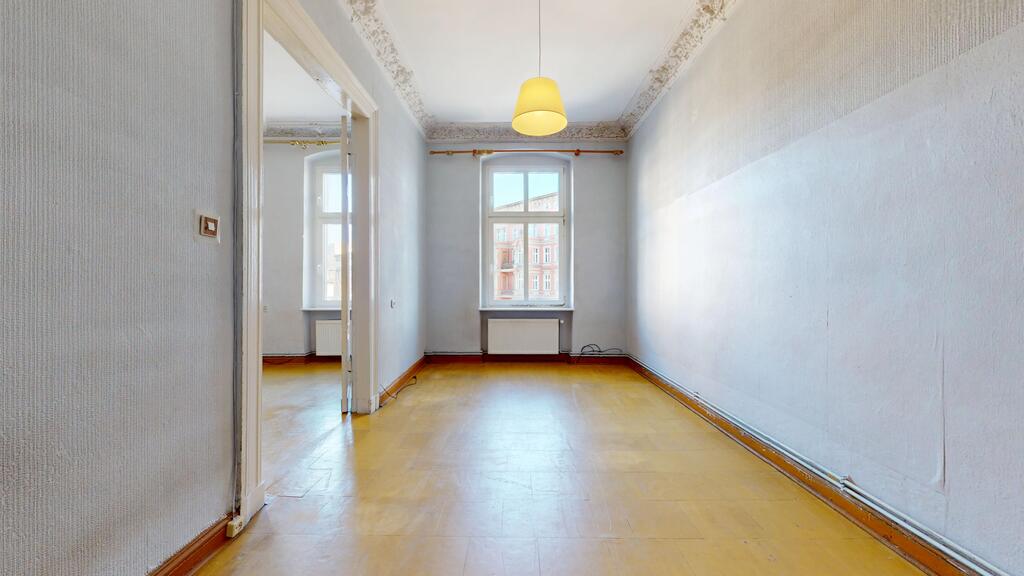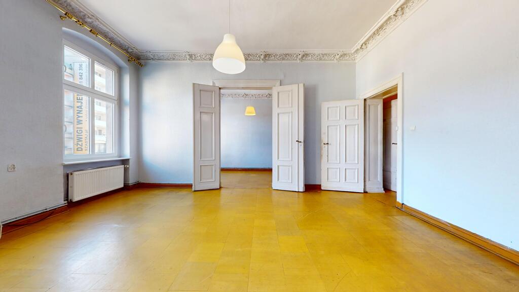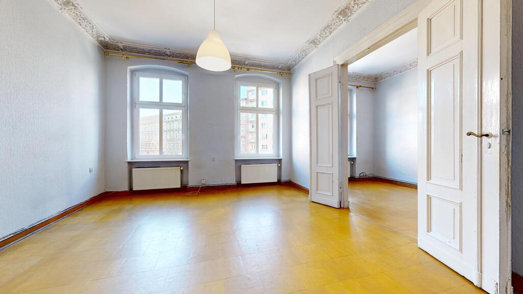 Oferujemy do sprzedaży duże mieszkanie do remontu, zlokalizowane na I piętrze secesyjnej kamienicy w ścisłym centrum Szczecina (narożnik Al. Wojska Polskiego/ul. Jagiellońska).
