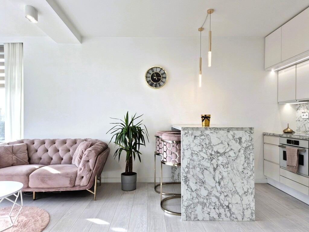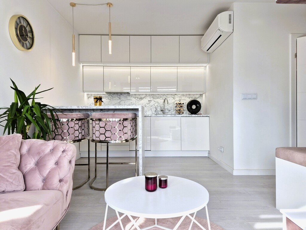 * gustownie wykończone i bogato wyposażone – w apartamencie znajdziemy meble w zabudowie (kuchnia, sypialnia, przedpokój), sprzęt AGD oraz wysokiej jakości meble wolnostojące (sofa, tapicerowane krzesła, łóżko)