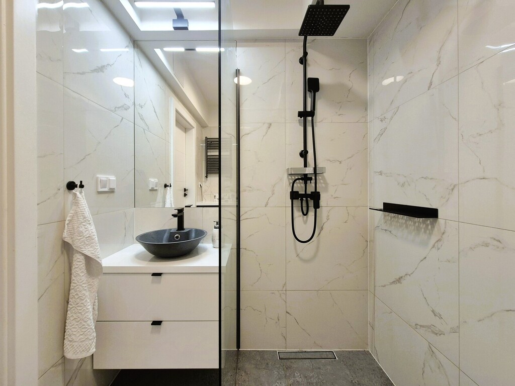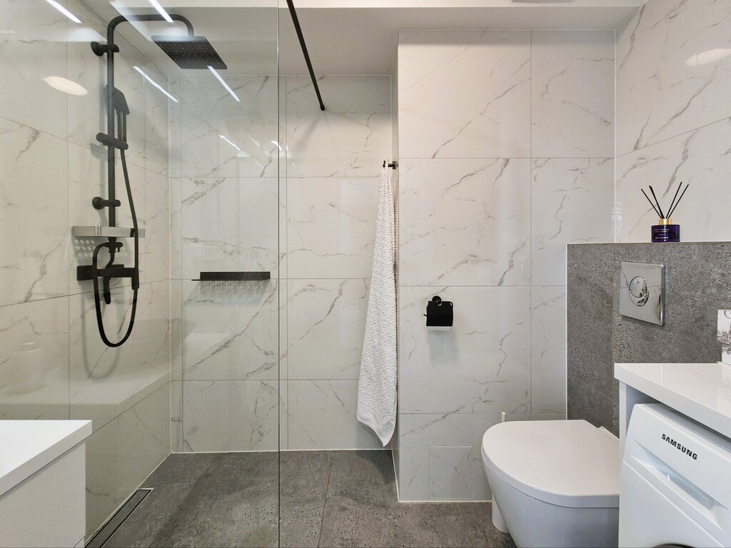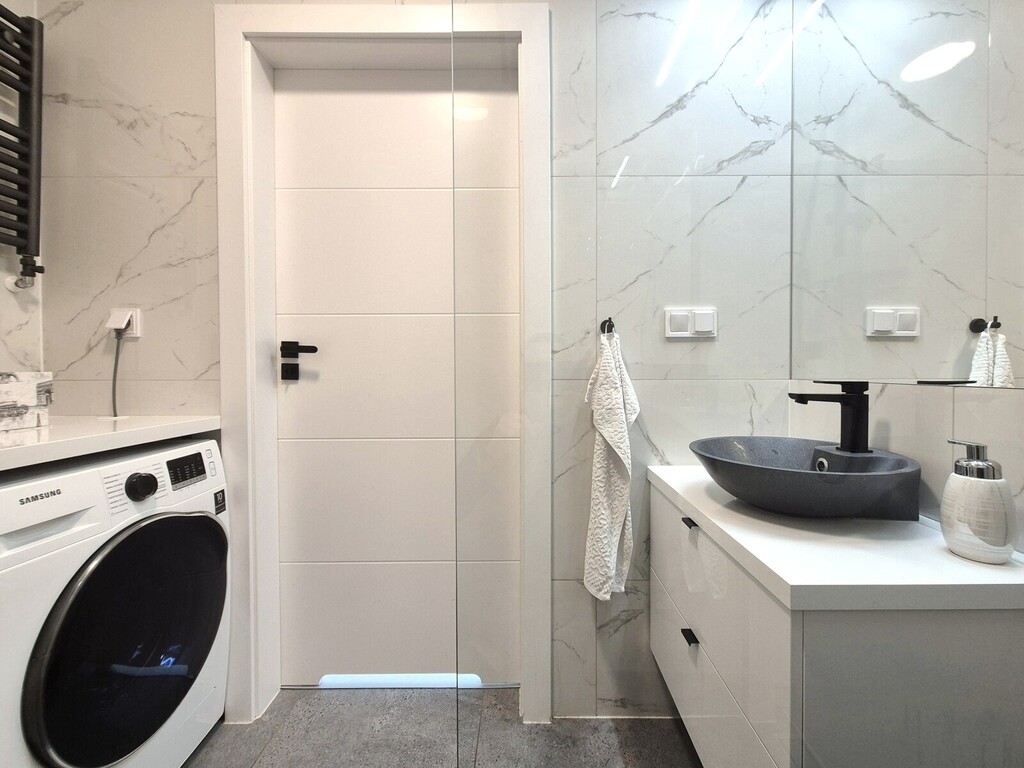 * duża łazienka z kabiną prysznicową, podtynkowym WC, umywalką i pralką