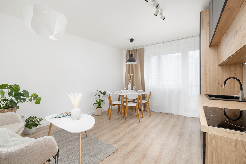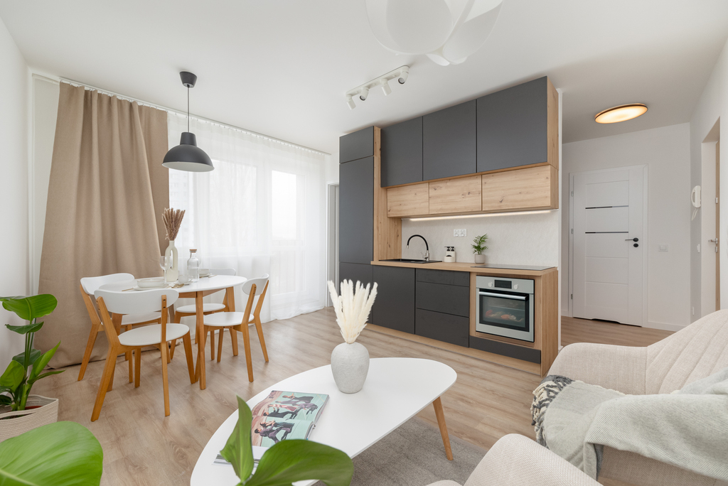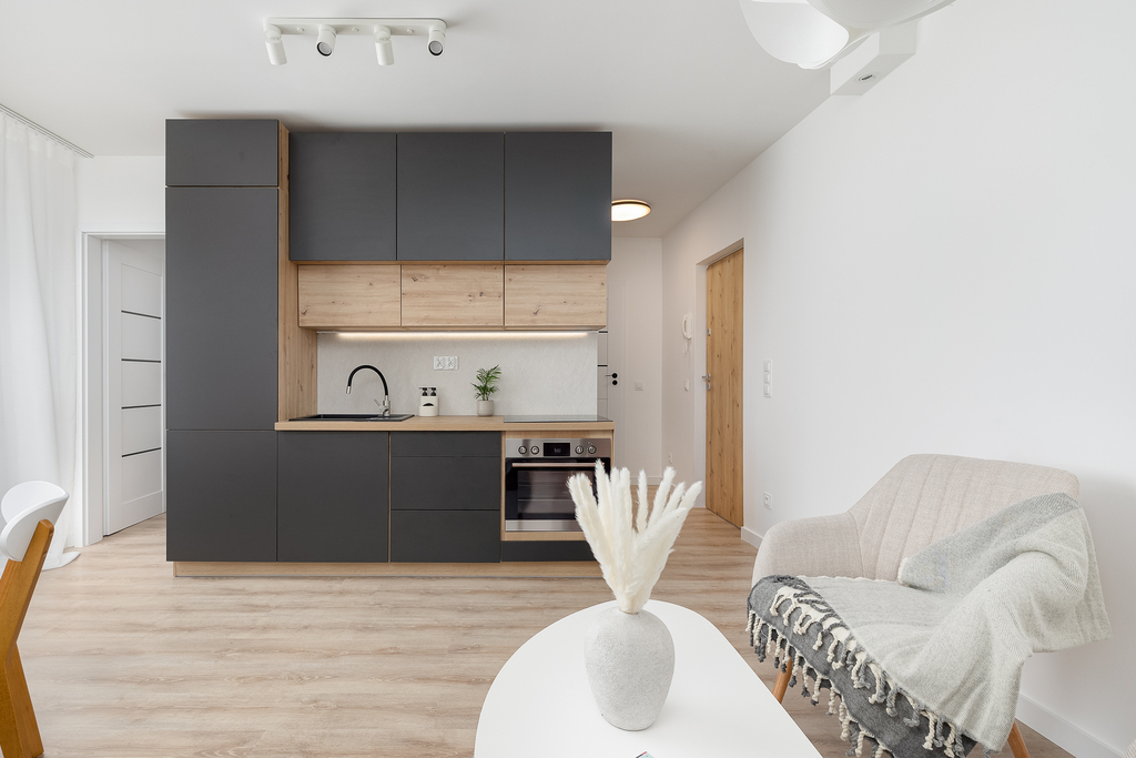Kuchnia w zabudowie pod wymiar z nowymi sprzętami to serce tego mieszkania.