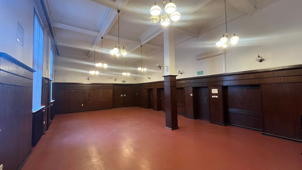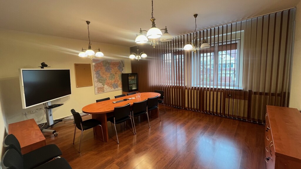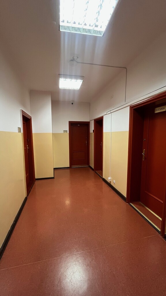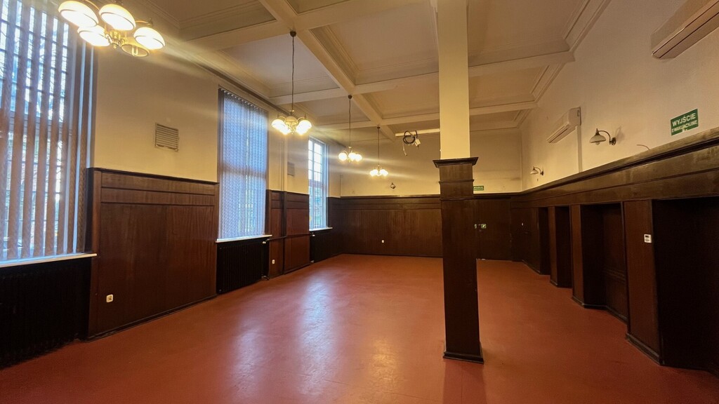 - parter (173,80m2)- klatka schodowa sekretariat, wc, pom. socjalne, 1 biuro, duża aula (91,22m2), 2 pom. gospod.,