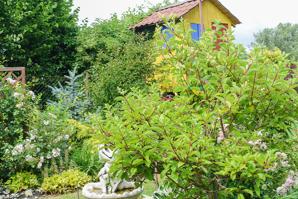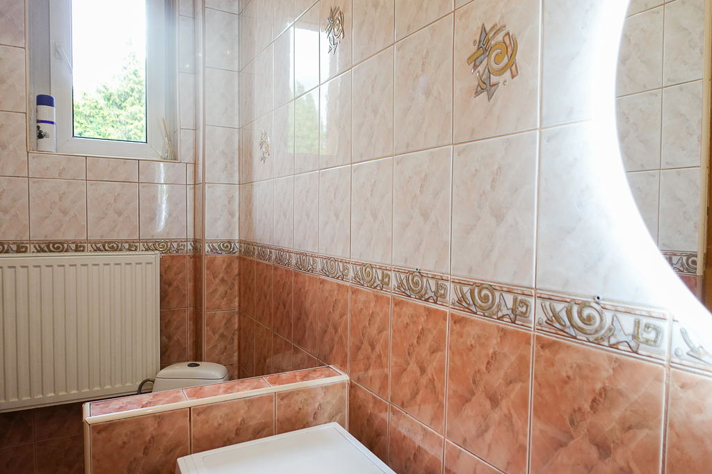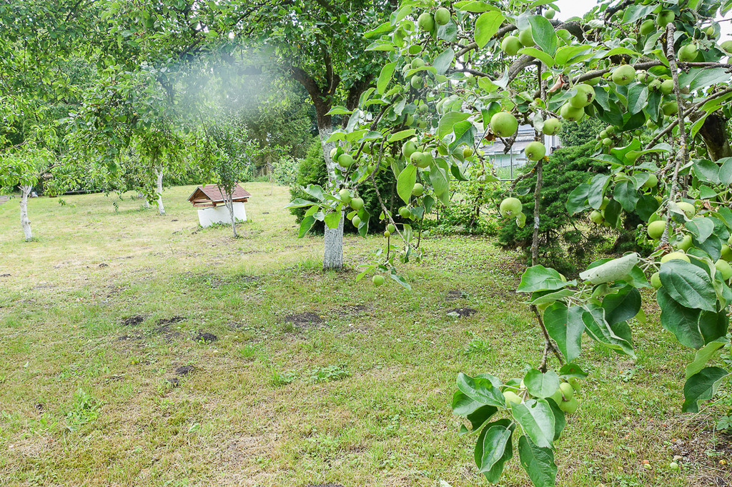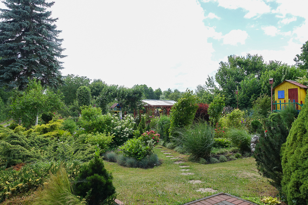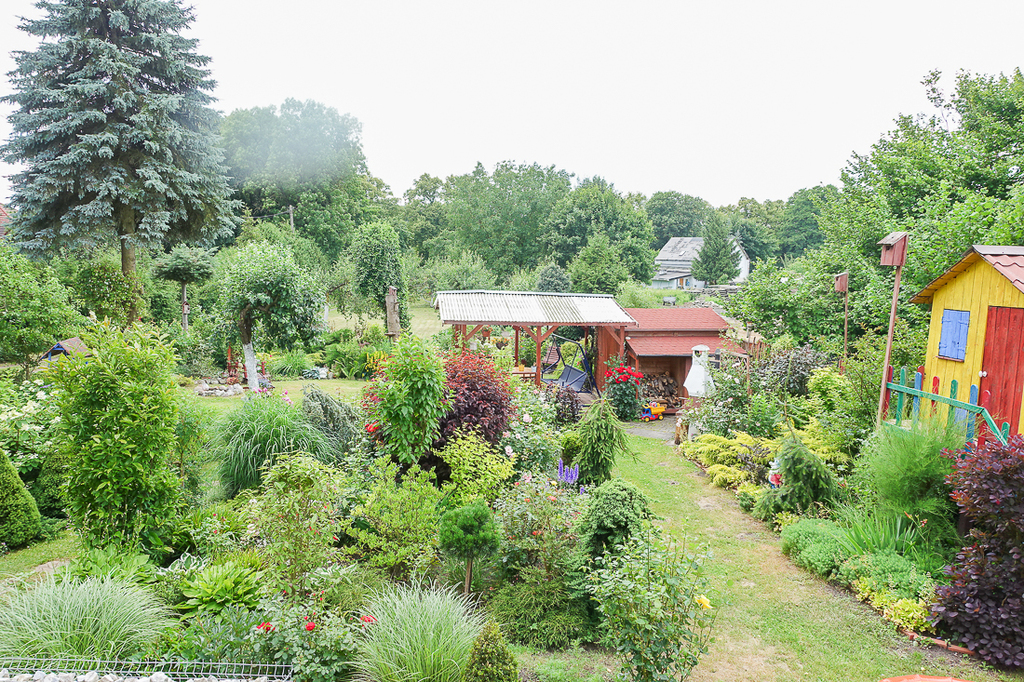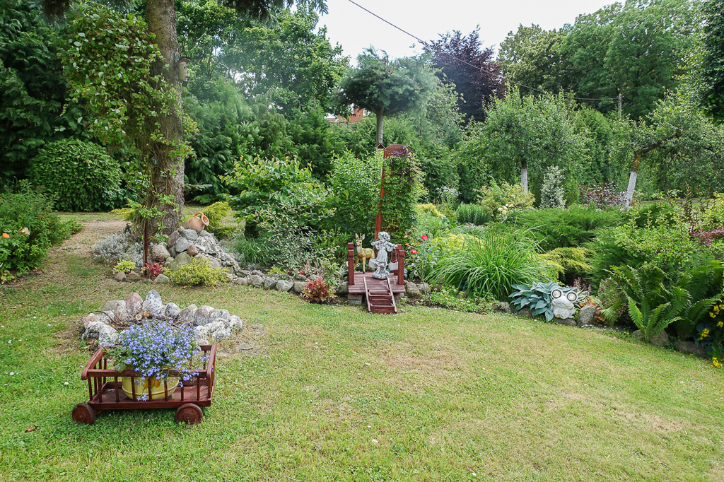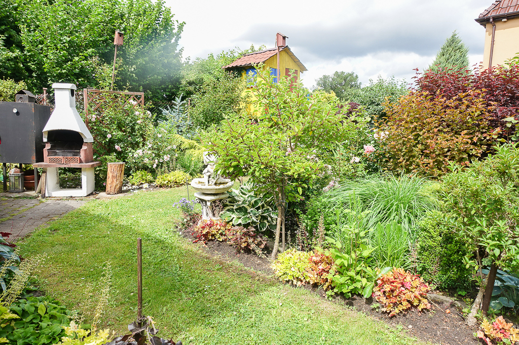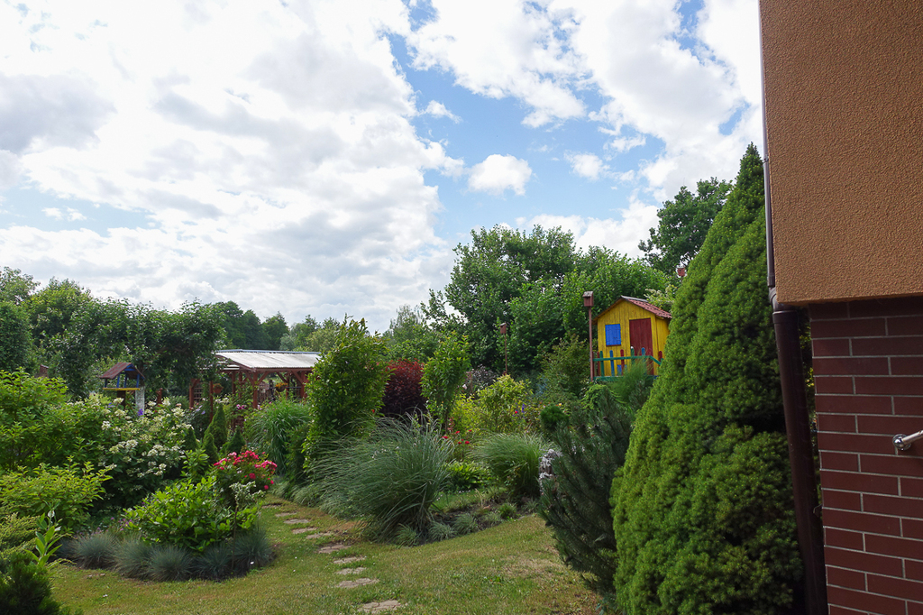 OPIS TERENU: działka 3340 m2, możliwość postawienia drugiego domu, ponadto nowa altana drewniana z tarasem, domek dla dzieci, duża ilość pięknych krzewów i nasadzeń, kwiatów wieloletnich, sad owocowy z jabłoniami, wiśniami, czereśniami, warzywniak, mała fontanna, pomieszczenie gospodarcze, 2 garaże o wysokości 2 m, jeden o powierzchni 12,5 m2, drugi 9 m2 każdy o długości 5 m i wysokości w najniższym punkcie 2 m. Nad garażami zagospodarowany strych.