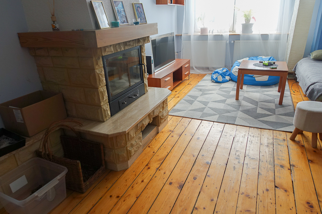 PARTER: salon o powierzchni 21 m2 z kominkiem i z przygotowanym wejściem na ewentualny, przyszły taras wykonano w tym celu okno do podłogi.