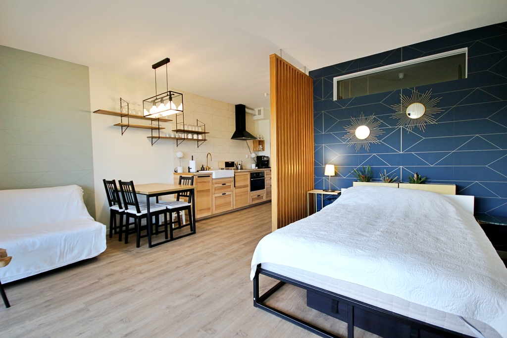 Przeznaczenie dla 2–4 osób – duże łóżko małżeńskie oraz sofa z funkcją spania