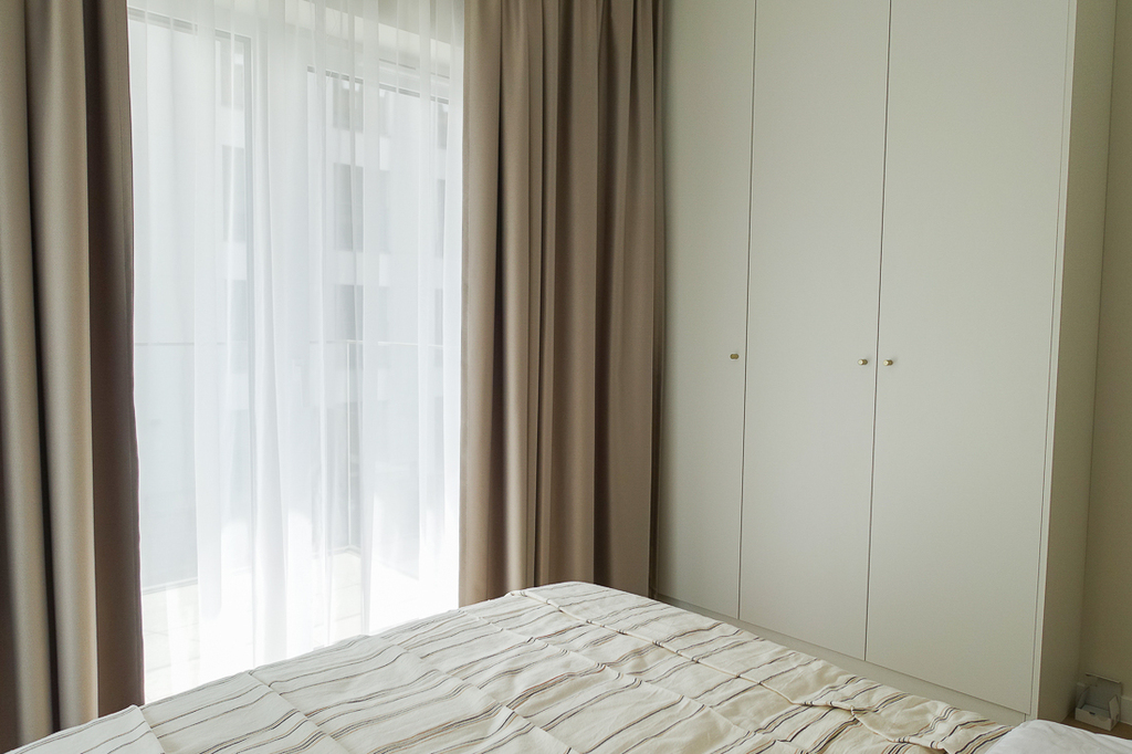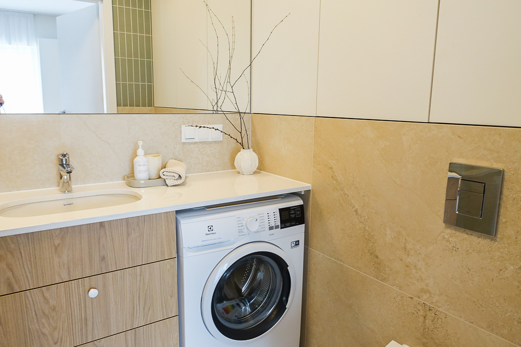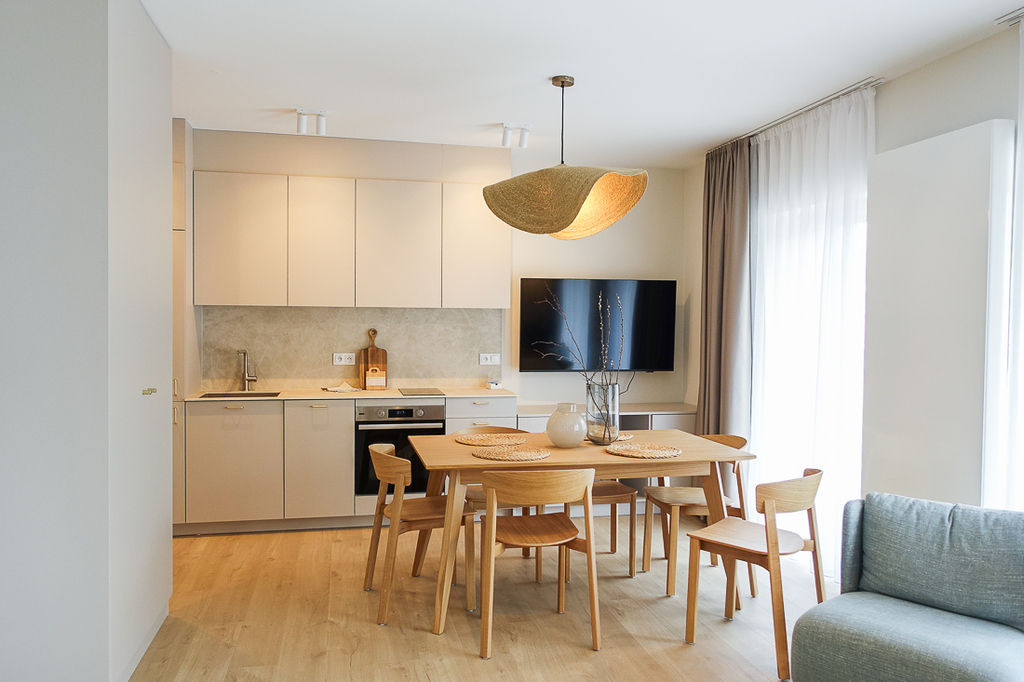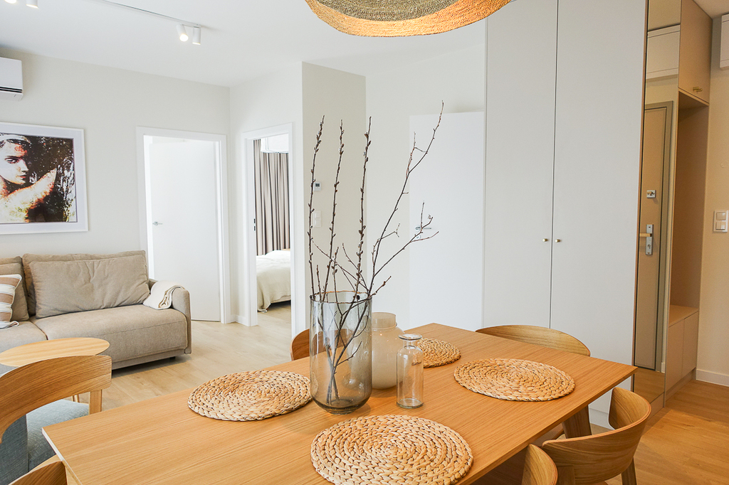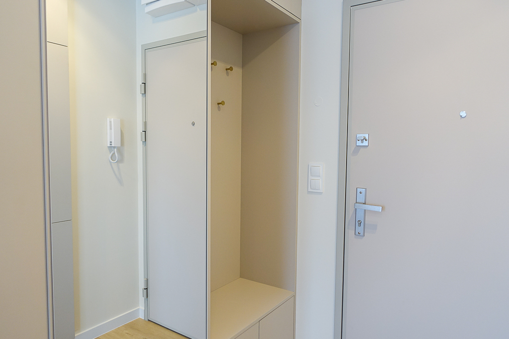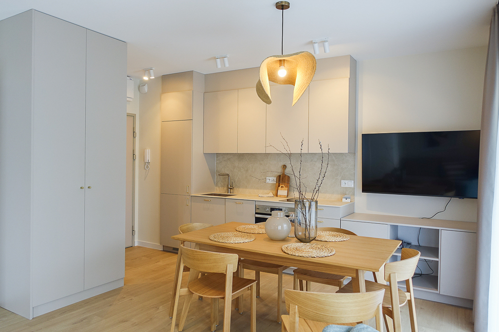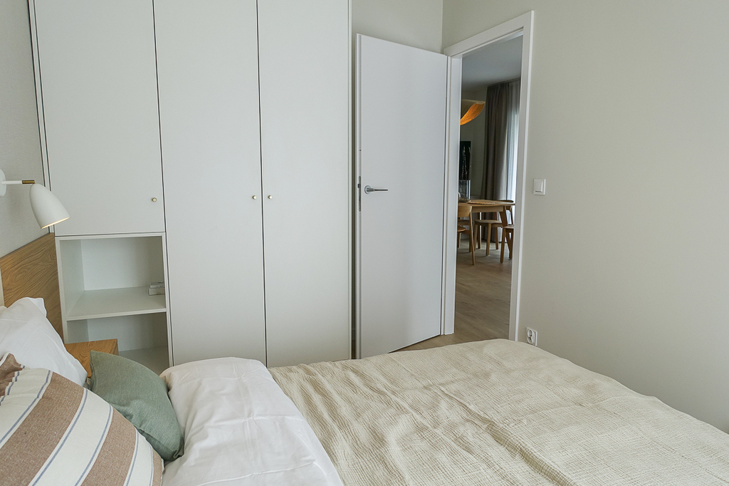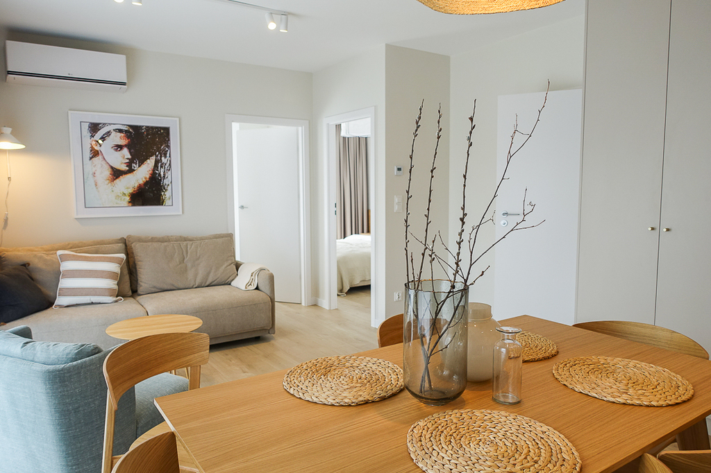 W przedpokoju szafa. W pokoju z aneksem kuchennym zabudowa kuchenna wraz z urządzeniami (zmywarka 45 cm, płyta indukcyjna, piekarnik elektryczny, zlewozmywak), wypoczynek, w łazience kabina prysznicowa, pralka, umywalka, 2 umeblowane sypialnie z szerokimi łóżkami i szafami. Z pokoju i sypialni wyjście na taras od strony południowej i zachodniej.