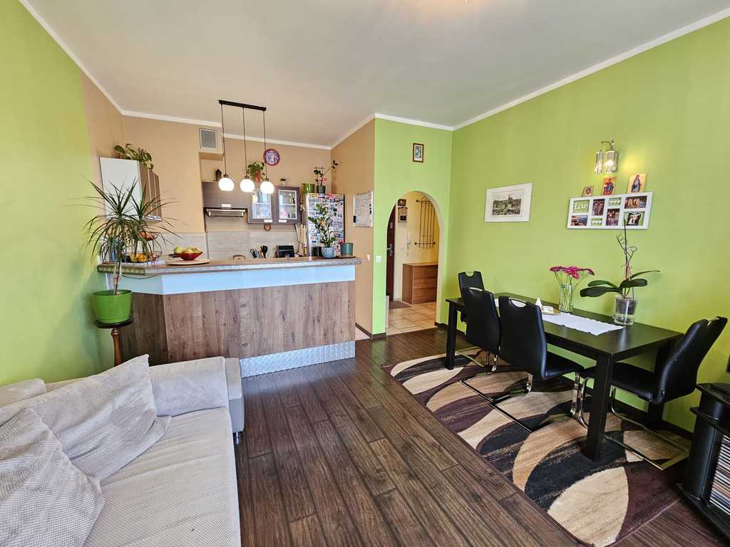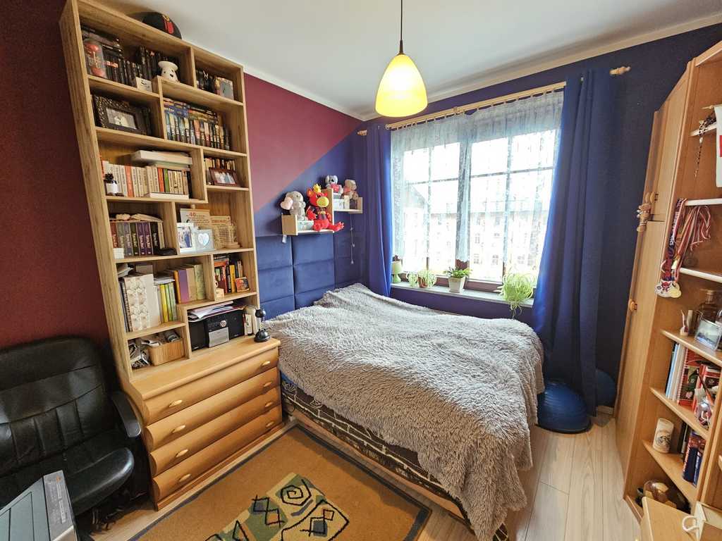 Mieszkanie rozkładowe o powierzchni 42,6m2 składa się z pokoju z aneksem kuchennym 21m2, sypialni 13,5m2, łazienki z wc 4,6m2 i przedpokoju 3,7m2. Z salonu wyjście na słoneczny balkon o powierzchni 5m2, z widokiem na plac zabaw.