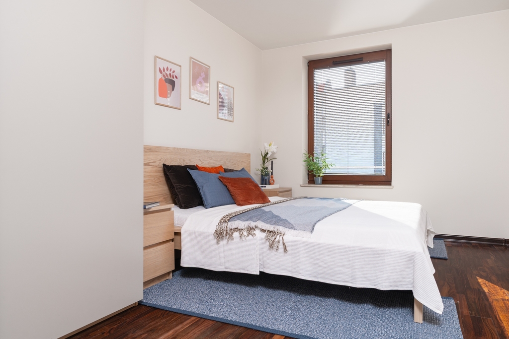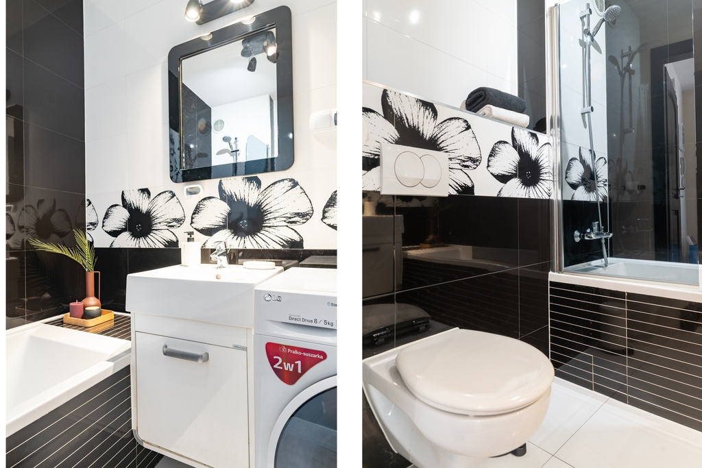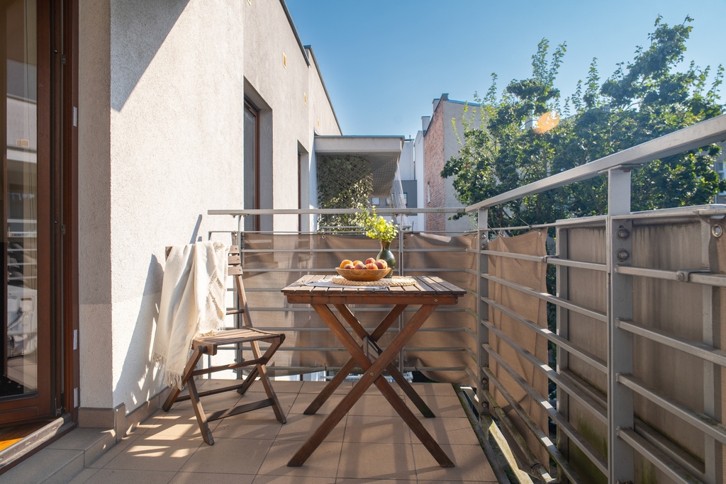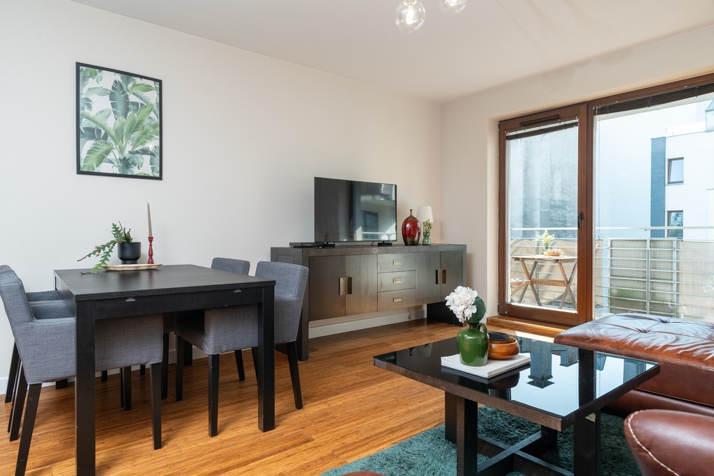Powierzchnia całego mieszkania to 51,85 m2. Lokal ma świetny układ dla singla lub pary - salon połączony z aneksem kuchennym i przedpokojem oraz oddzielna sypialnia z wygodnym łóżkiem i dużą szafą. Do tego łazienka z wanną, przedsionek z kolejną szafą oraz pomieszczenie gospodarcze. Z salonu jest wyjście na spory, ponad 6-metrowy balkon. Mieszkańcy mogą korzystać z wózkowni-rowerowni na parterze budynku.