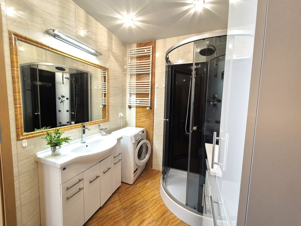 Łazienka w glazurze i terakocie z oświetleniem sufitowym, na wyposażeniu umywalka, podwieszana miska wc oraz kabina prysznicowa z hydromasażem.