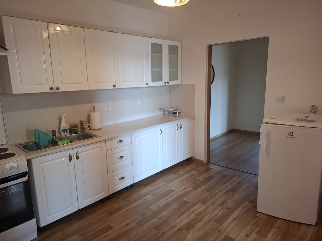 Kuchnia wyposażona jest w kuchenkę elektryczną z piekarnikiem, pochłaniacz, nowe białe meble kuchenne i lodówkę .