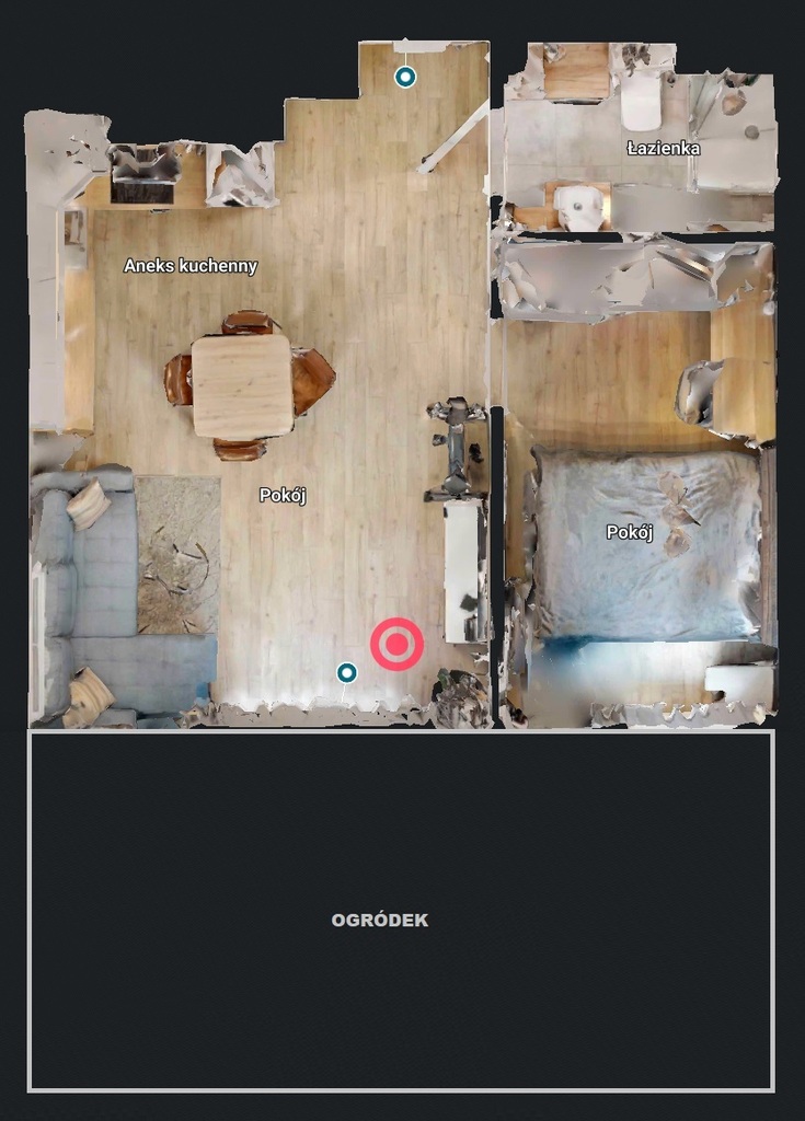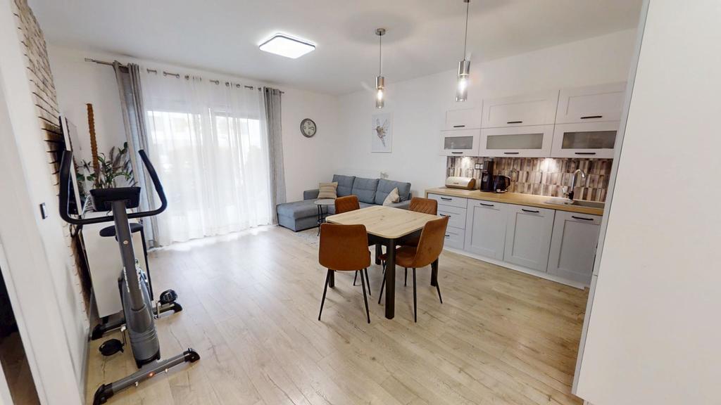 • salon z aneksem kuchennym i wyjściem na pięknie zagospodarowany, zielony ogródek o powierzchni 34m2,