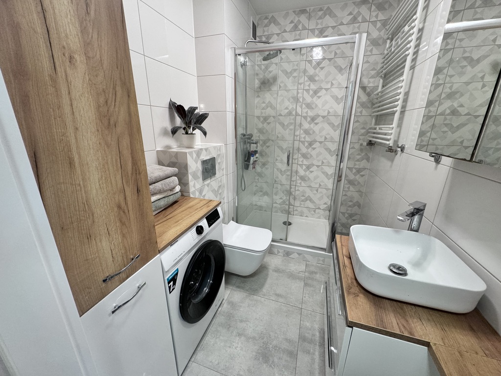 • łazienka z kabiną prysznicową i toaletą