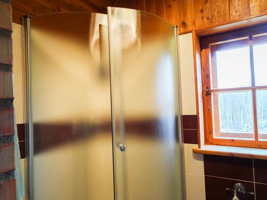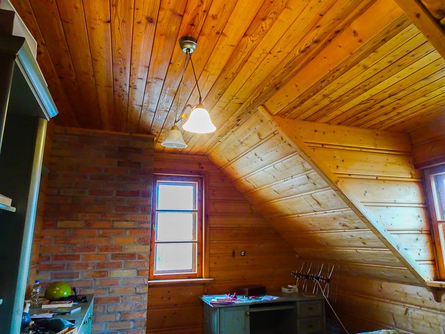 PIĘTRO: powstało prawie w całości z elementów z przeniesionego domu góralskiego. Bale z drewna smrek tatrzański, podłoga świerkowa, na suficie oryginalne deski, okna z modrzewia. Salon o powierzchni 30,13 m2, z czynnym kominkiem żeliwnym, nowym obłożonym kamieniem, sypialnia 22,94 m2, dodatkowo łazienka 5,31 m2, z oknem w glazurze i terakocie, a w niej wanna, umywalka, WC razem. Z sypialni wyjście na balkon.