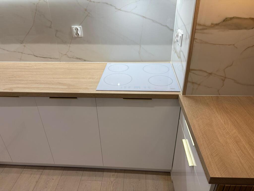 Nowoczesna kuchnia z miejscem na piekarnik i lodówkę. Zamontowana płyta indukcyjna .