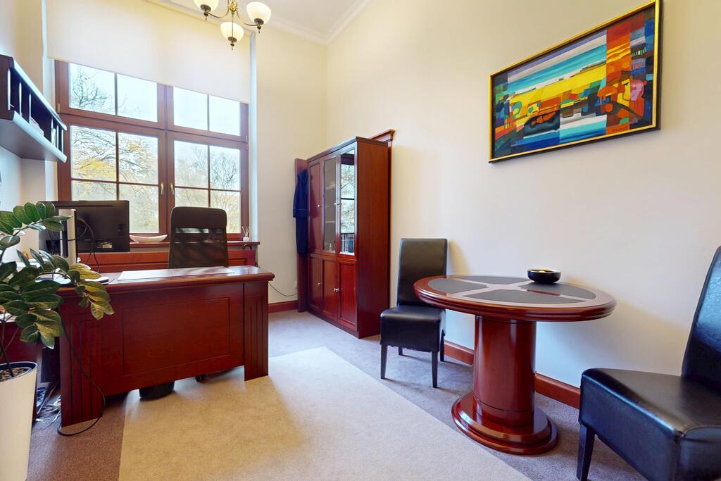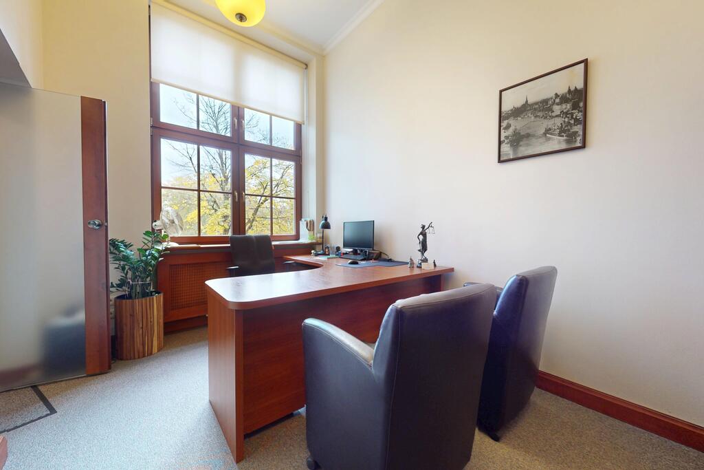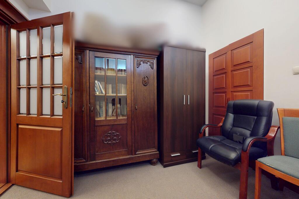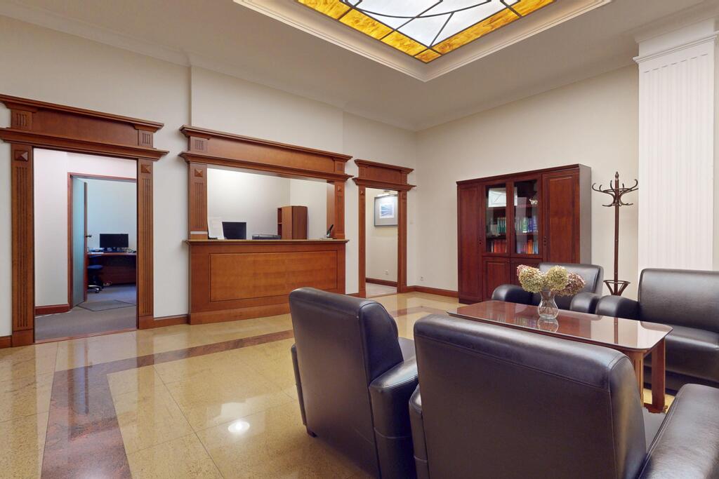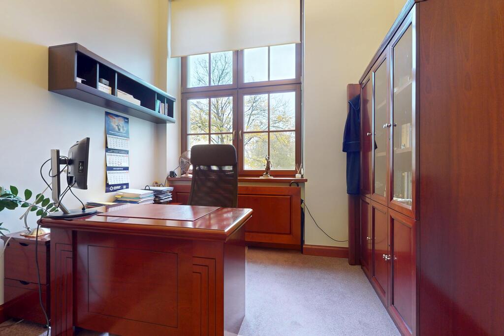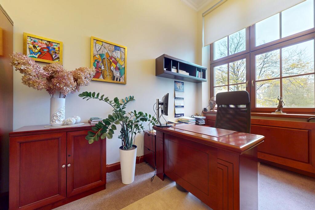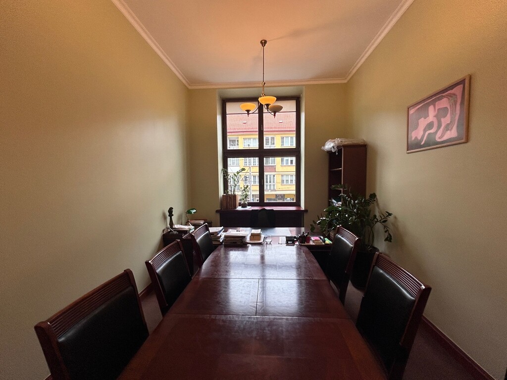 Pierwsza część o powierzchni 240 m² jest kompletnie wykończona w bardzo wysokim standardzie, z wnętrzami utrzymanymi w stylowym, eleganckim charakterze. W jej skład wchodzi przestronny i reprezentacyjny hol, który stanowi doskonałe pierwsze wrażenie dla klientów oraz wizytówkę lokalu. Dalej znajduje się pięć okazałych, reprezentacyjnych gabinetów, zaprojektowanych z dbałością o detale i komfort pracy. Wydzielono również część socjalną, obejmującą toaletę oraz w pełni wyposażoną kuchnię, co zapewnia wygodę codziennego użytkowania. Ta część lokalu jest gotowa do natychmiastowego wprowadzenia i doskonale nadaje się na kancelarię notarialną, adwokacką, biuro doradcze, gabinety lekarskie lub prestiżową siedzibę firmy.