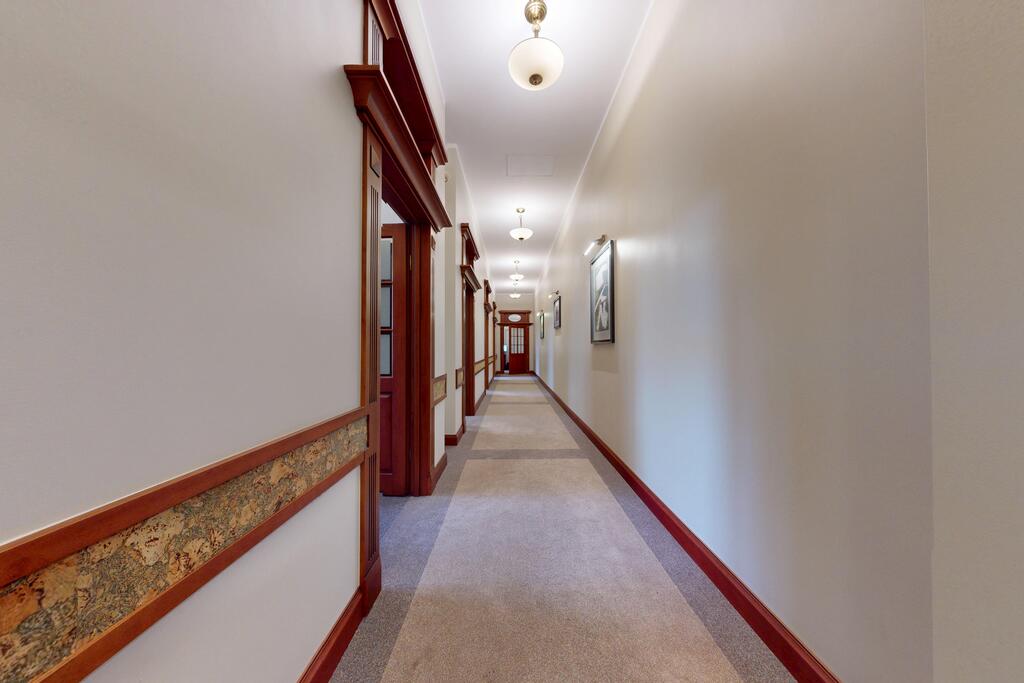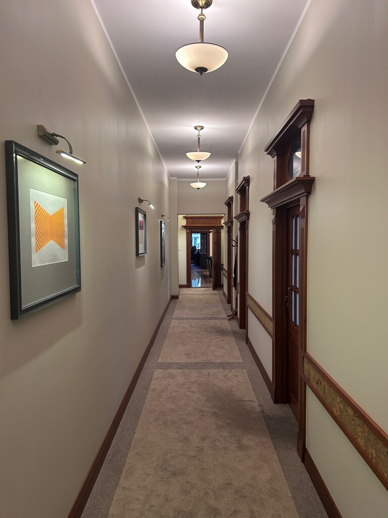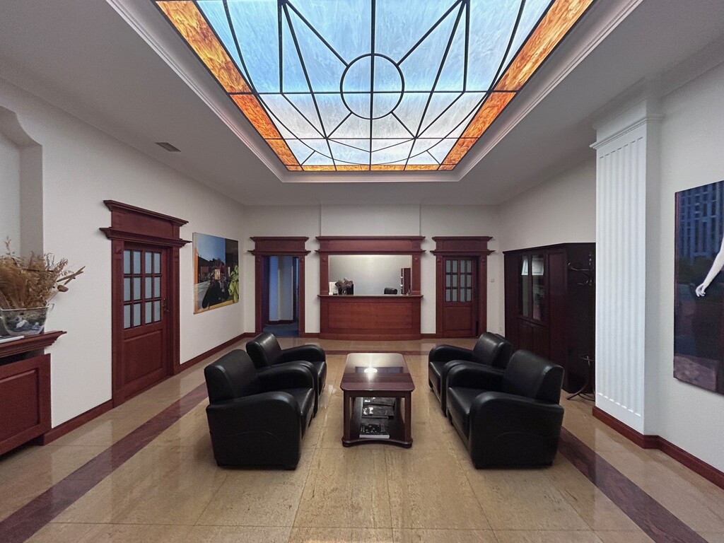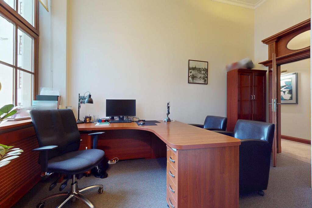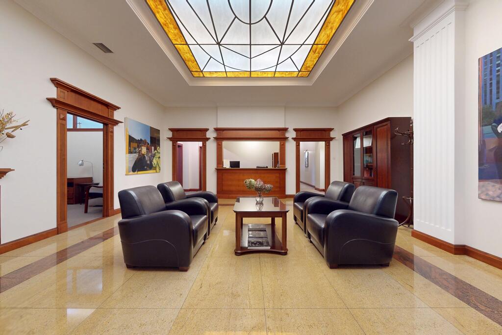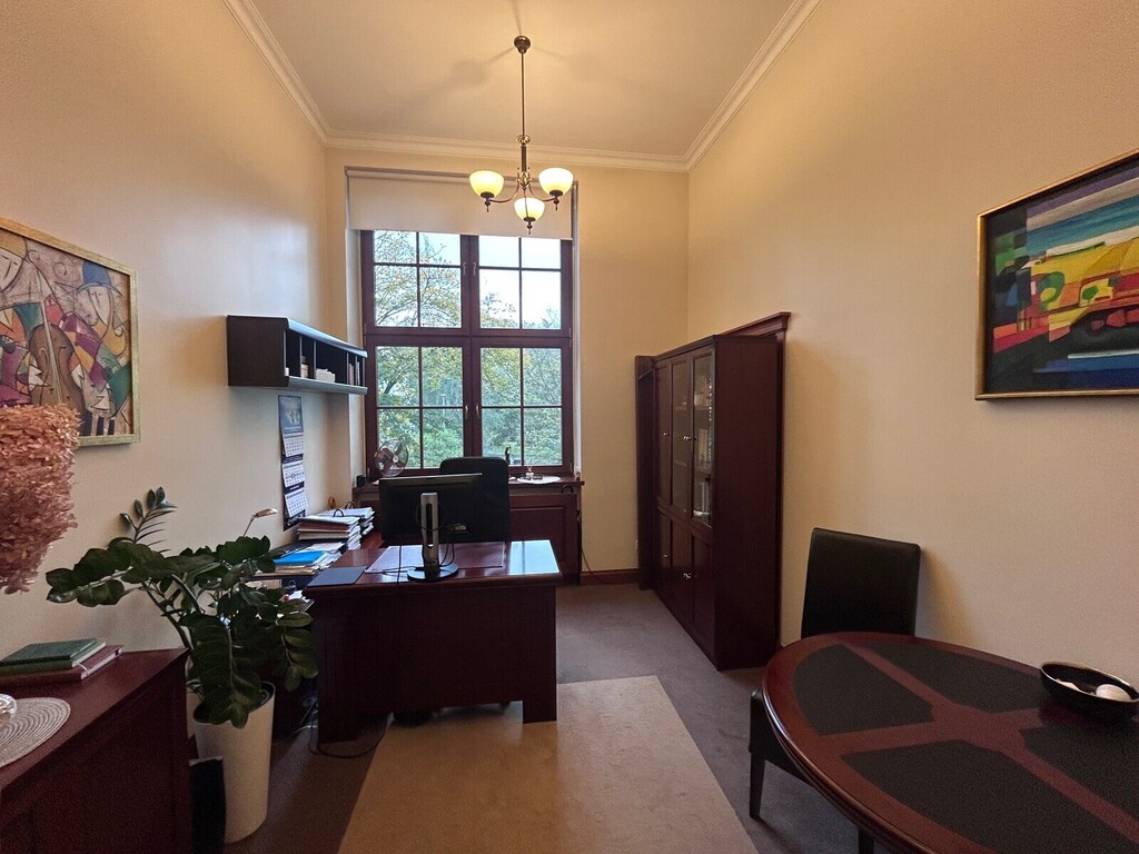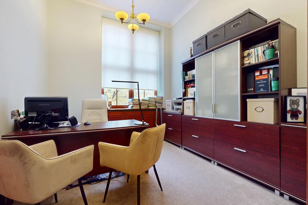 Pierwsza część o powierzchni 240 m² jest kompletnie wykończona w bardzo wysokim standardzie, z wnętrzami utrzymanymi w stylowym, eleganckim charakterze. W jej skład wchodzi przestronny i reprezentacyjny hol, który stanowi doskonałe pierwsze wrażenie dla klientów oraz wizytówkę lokalu. Dalej znajduje się pięć okazałych, reprezentacyjnych gabinetów, zaprojektowanych z dbałością o detale i komfort pracy. Wydzielono również część socjalną, obejmującą toaletę oraz w pełni wyposażoną kuchnię, co zapewnia wygodę codziennego użytkowania. Ta część lokalu jest gotowa do natychmiastowego wprowadzenia i doskonale nadaje się na kancelarię notarialną, adwokacką, biuro doradcze, gabinety lekarskie lub prestiżową siedzibę firmy.