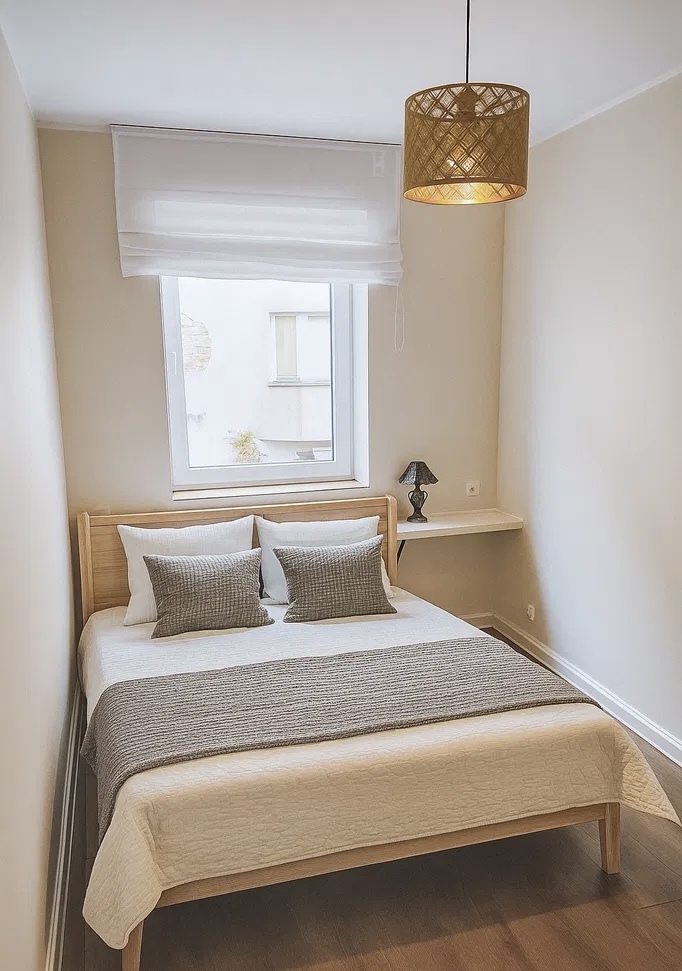 - Sypialnia: wystarczająco przestronna, by wygodnie pomieścić duże łóżko i pojemną szafę – idealne miejsce do odpoczynku.
