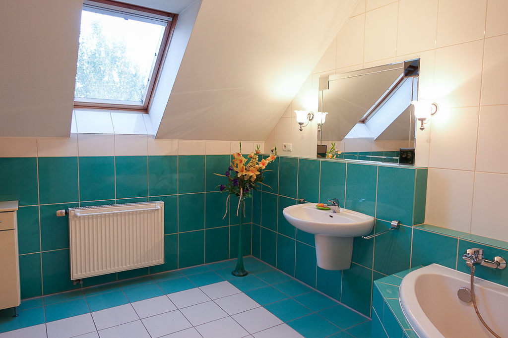 *Łazienka o powierzchni 11,1 m² (po podłodze 13,5 m²) z wanną, umywalką, WC i bidetem, z możliwość zainstalowania kabiny prysznicowej, okno połaciowe.