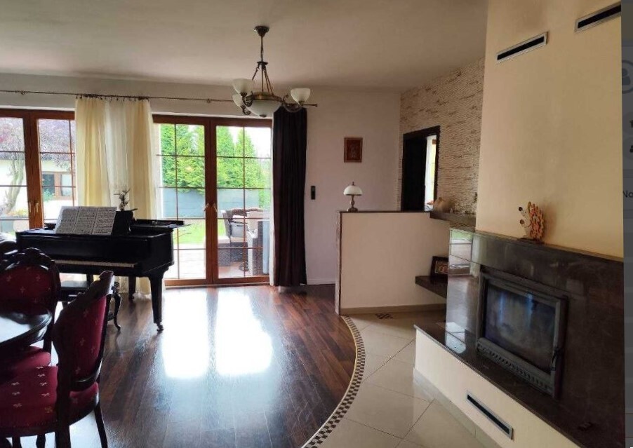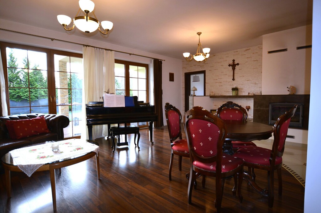 - Przestronny salon z kominkiem (32 m²) oraz wyjściem na taras,