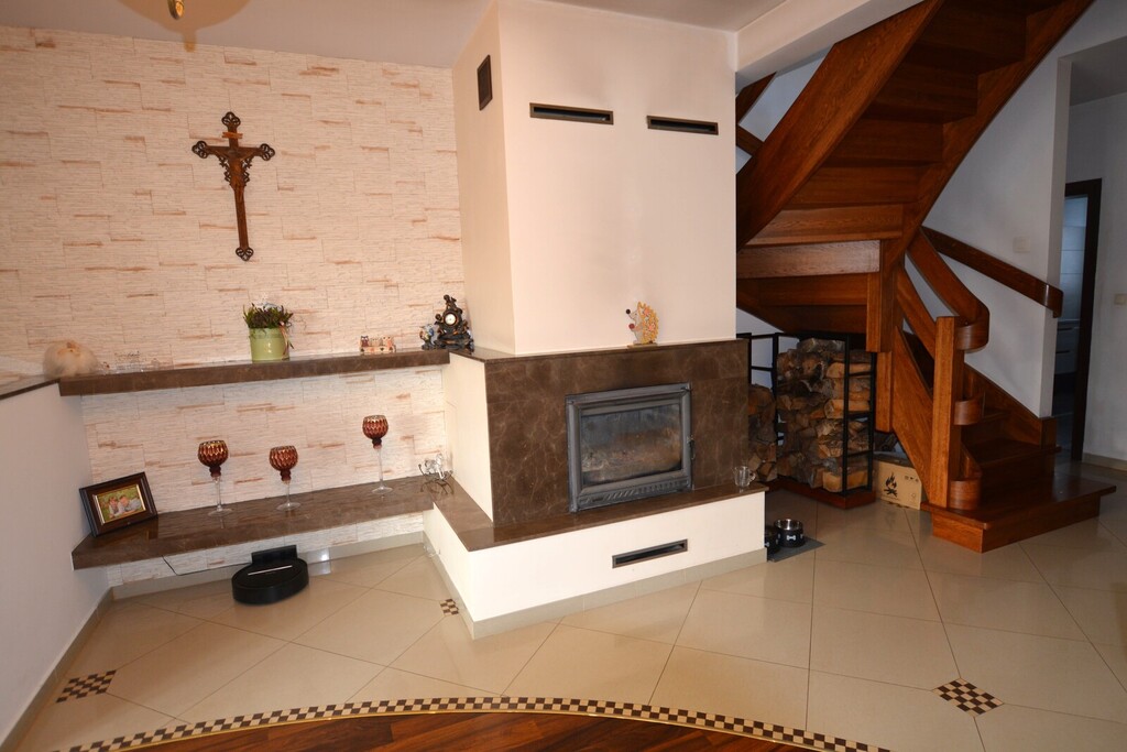 - ogrzewanie gazowe: podłogowe na parterze, grzejniki na piętrze oraz kominek z płaszczem wodnym .