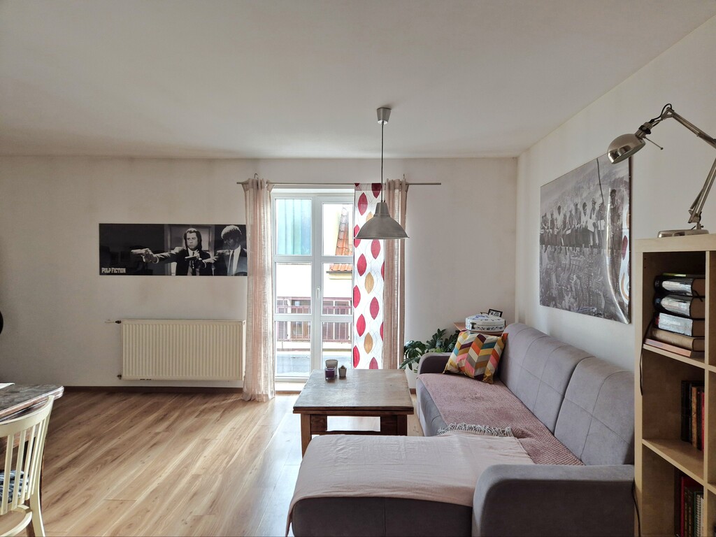 * salon z wyjściem na duży balkon