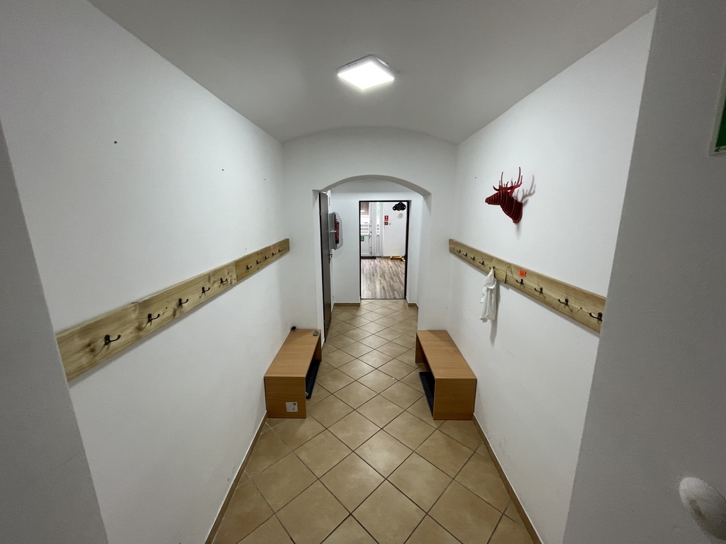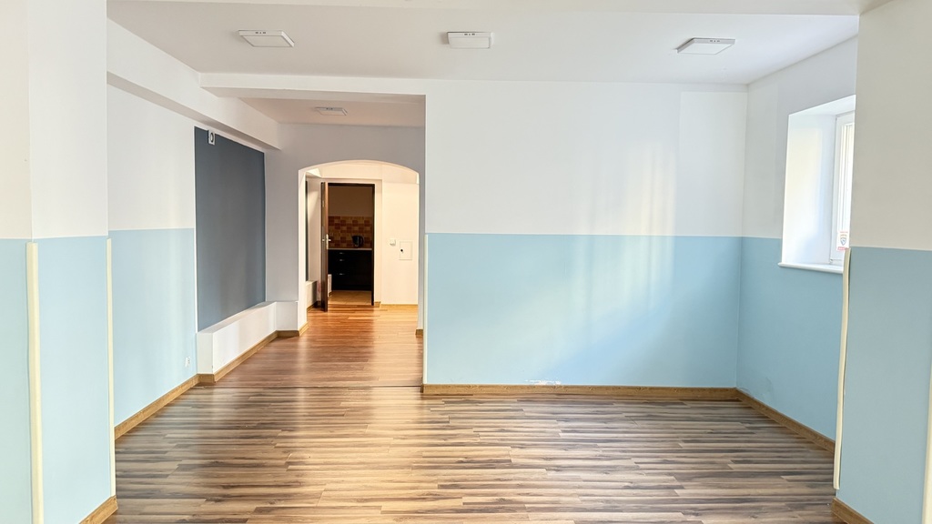 Główna sala ma ok. 80m2, dodatkowy pokój jest o pow. 25m2, dodatkowo zaplecze socjalne (kuchnia, 2 toalety, korytarz z szatnią).